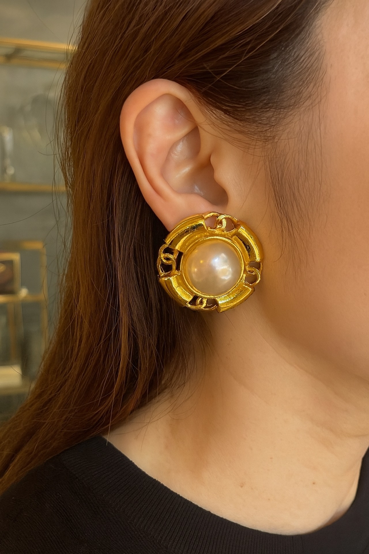 このイヤリングは、中央にシャネルらしい光沢のある**フェイクパール**を配し、それを**ゴールドトーンのメタルパーツ**が囲む印象的なラウンドデザインが特徴です。