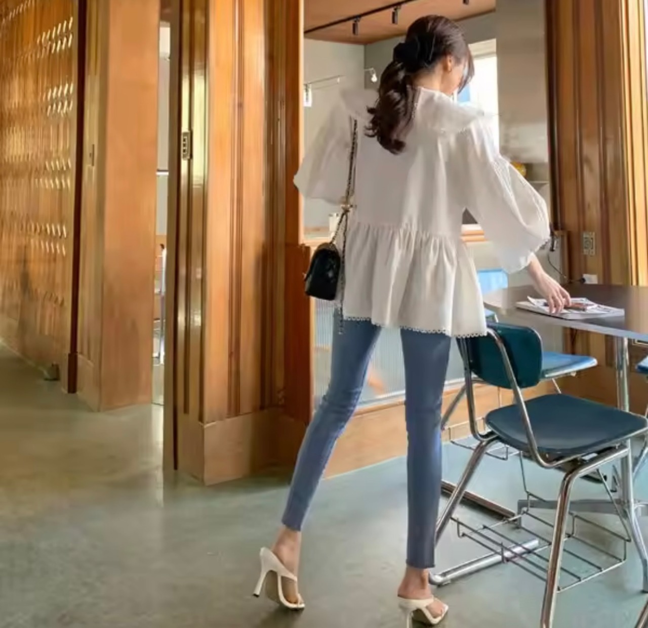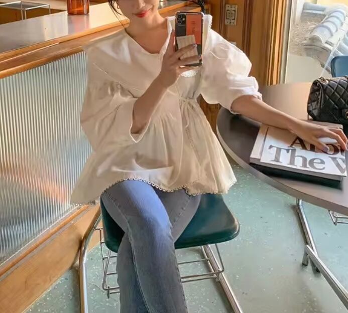 -ふんわりボリュームスリーブ**で、二の腕をさりげなくカバー。動きに合わせて揺れるシルエットが女性らしさを引き立てます。
