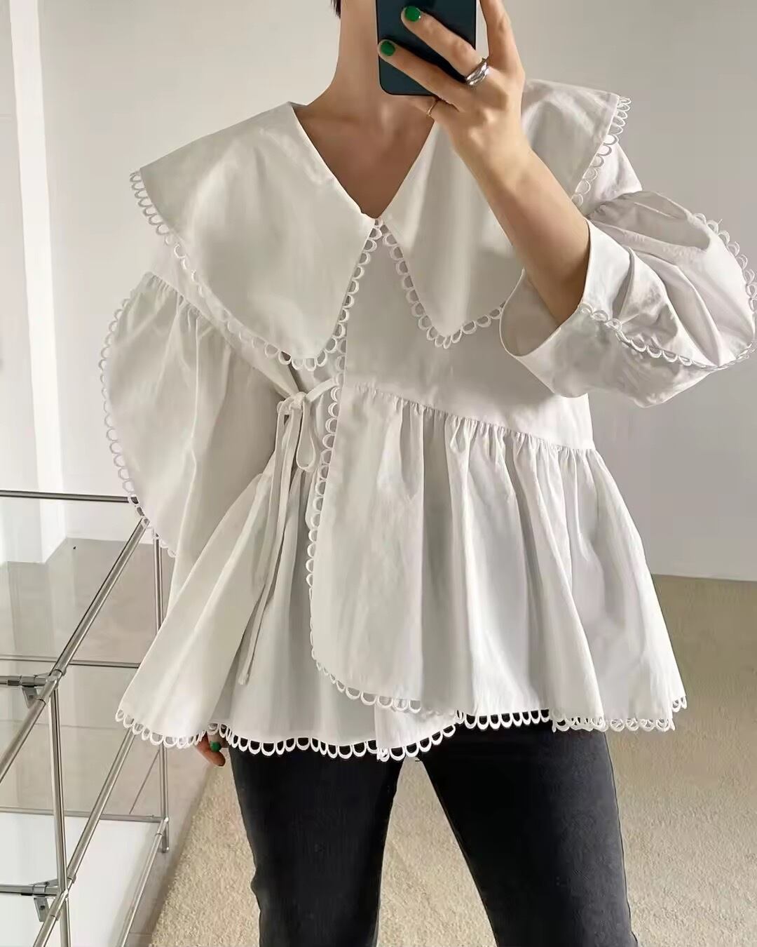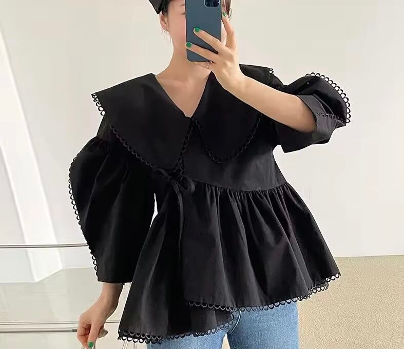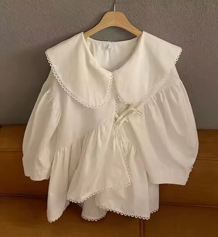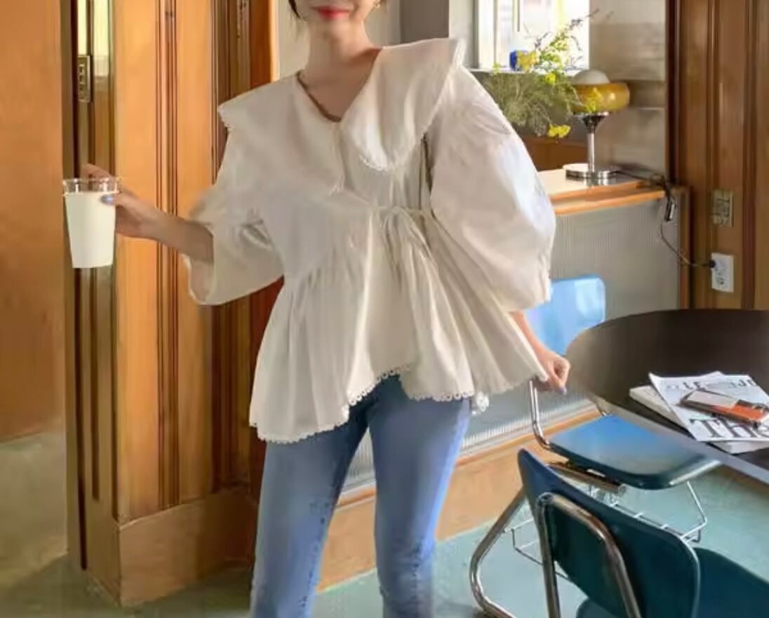- **大きめのカラー**が顔周りをパッと華やかにしつつ、小顔効果も抜群。縁取りのループレースが繊細で上品な印象をプラス。