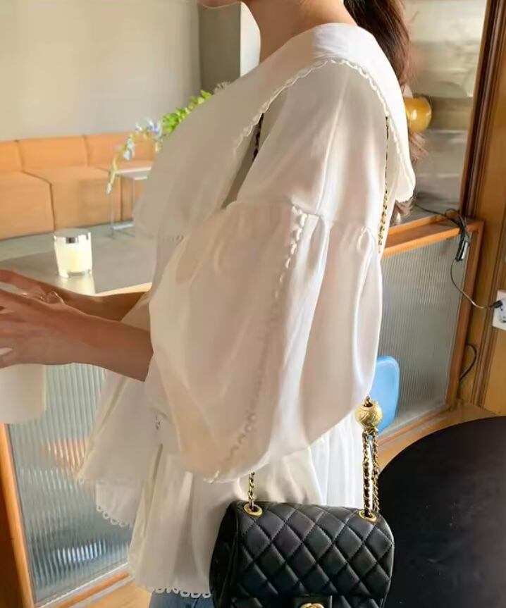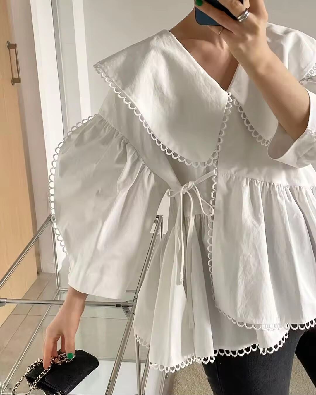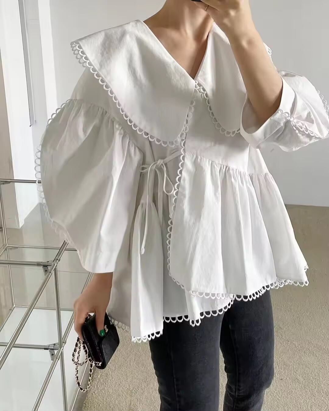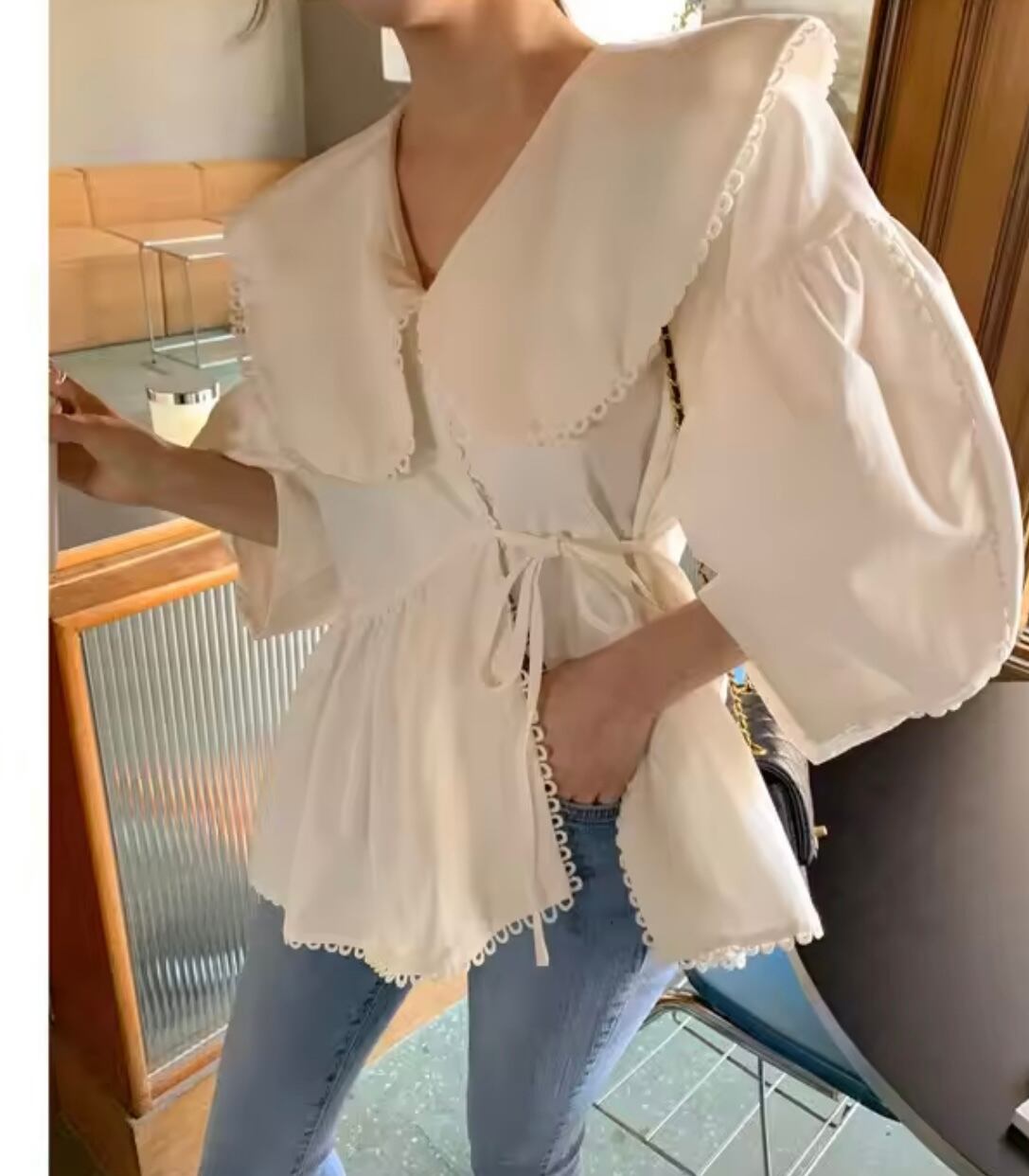 - **大きめのカラー**が顔周りをパッと華やかにしつつ、小顔効果も抜群。縁取りのループレースが繊細で上品な印象をプラス。