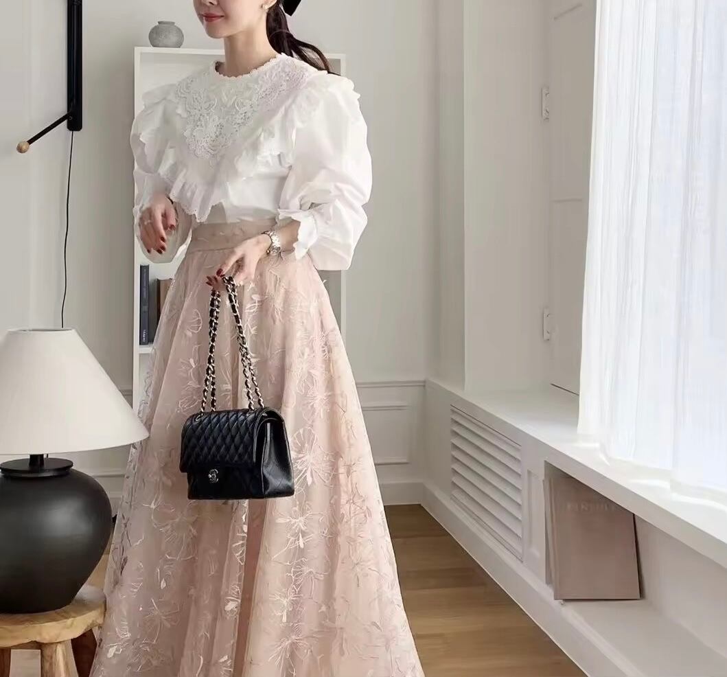 リピ様続出2色無敵パーフェクト刺繍ブラウス半袖フリー完璧な美しさトップス大きめフリル大人かわいい着痩スカート デニム