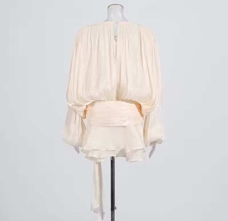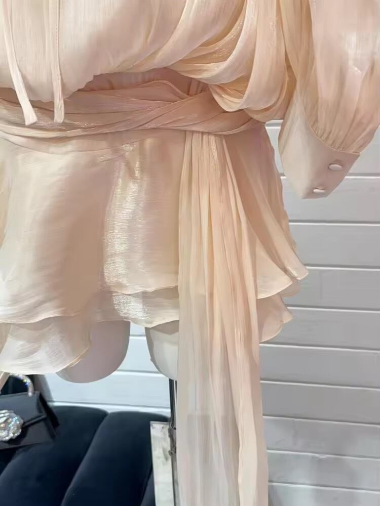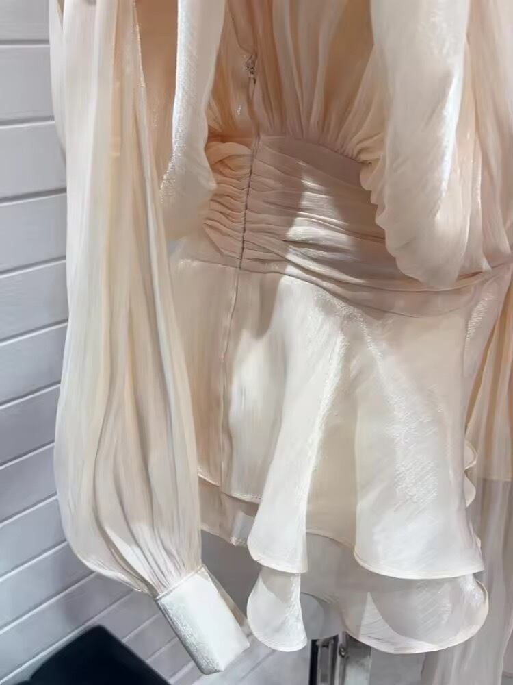 贅沢に寄せられたドレープが肩から流れ、ウエストをきゅっと締めたシルエットがメリハリのある美しいラインを演出。透け感のある素材が光をまとい、動くたびに優雅な印象を残します。