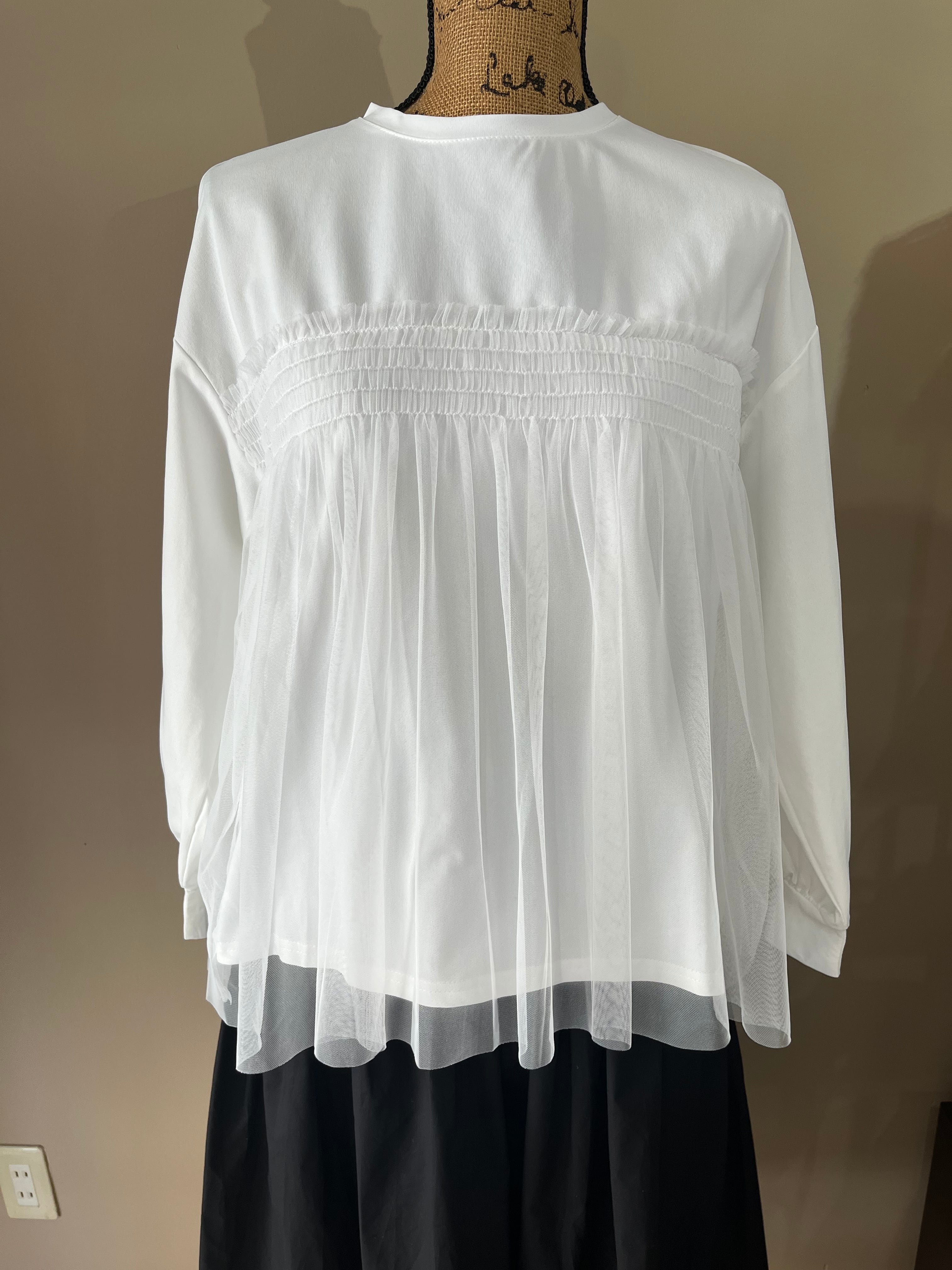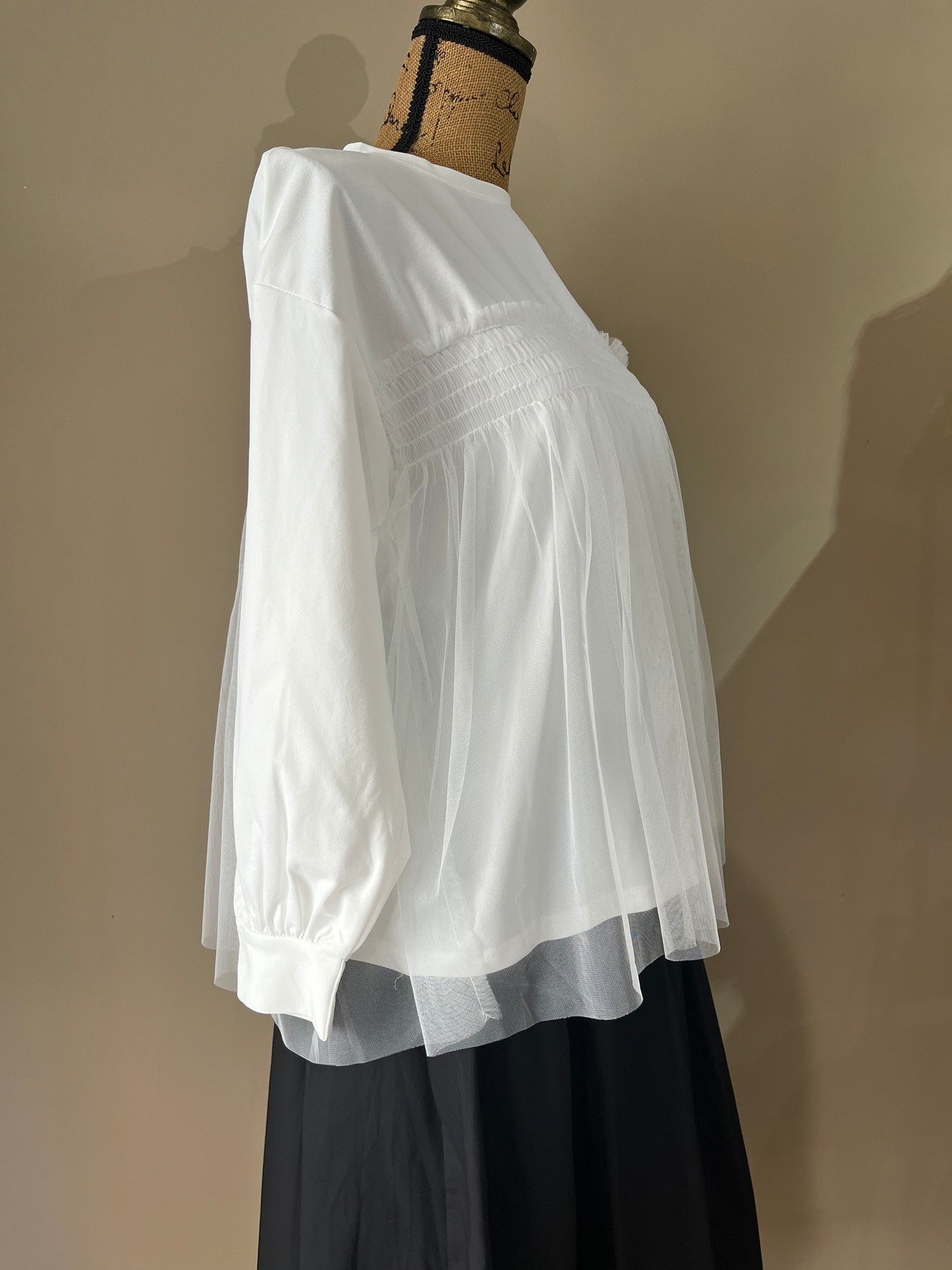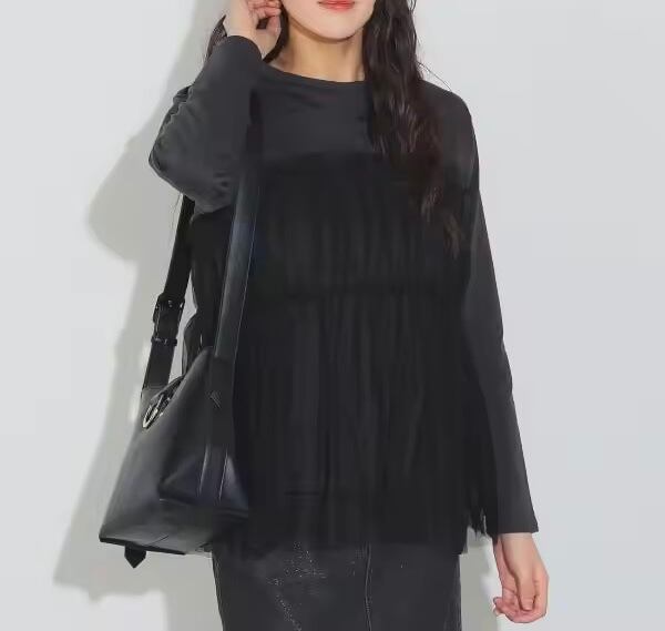 2色 忙しい日々の主役にも、体型カバーにUV対策大人可愛いを纏う瞬間 シンプル異素材チュールロンTシャツ重ね着トップス