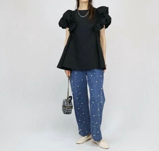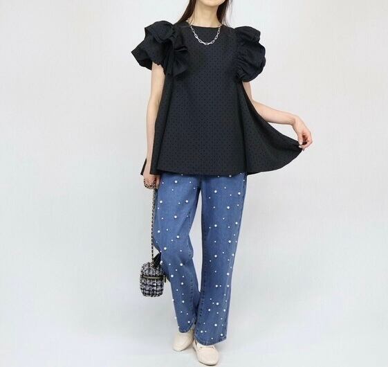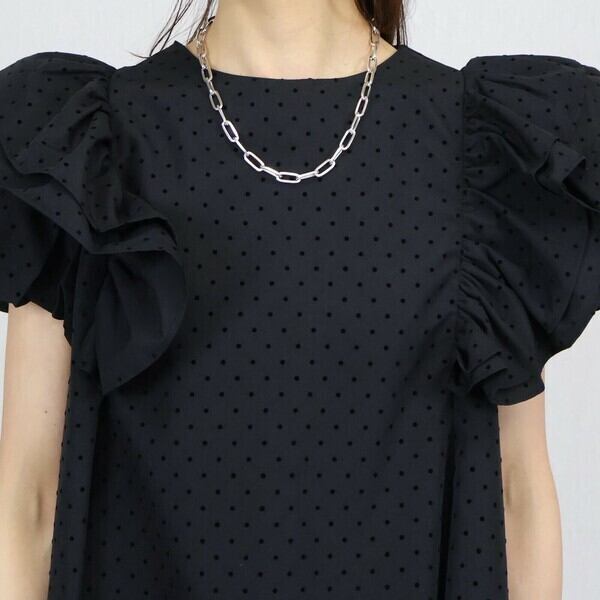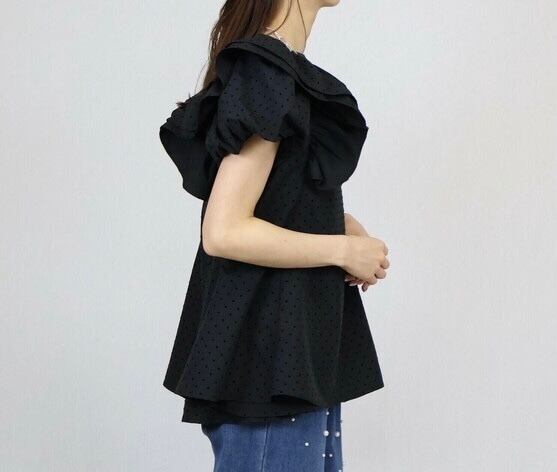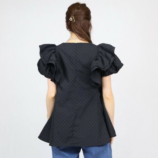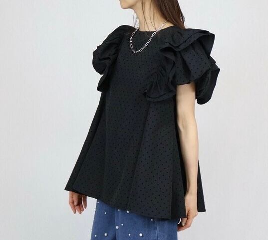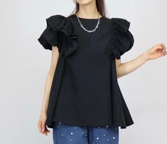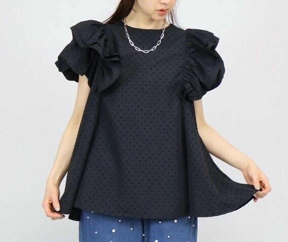 Miroirfrillミロワールフリルドットブラウス ふんわり立体フリル袖×Aライン ドットトップス ふんわりフリー