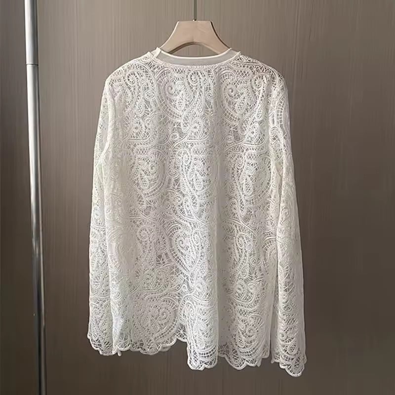 レースブラウス/アンティーク調/透け感トップス/韓国ファッション/フェミニンコーデ/長袖トップス/重ね着コーデ/丸首ブラウス/大きいサイズ対応/春秋コーデ/大人可愛い/上品ナチュラル/クラシカルコーデ/白ブラウス/エレガントスタイル