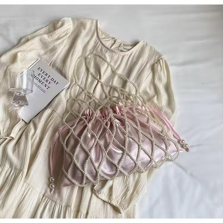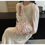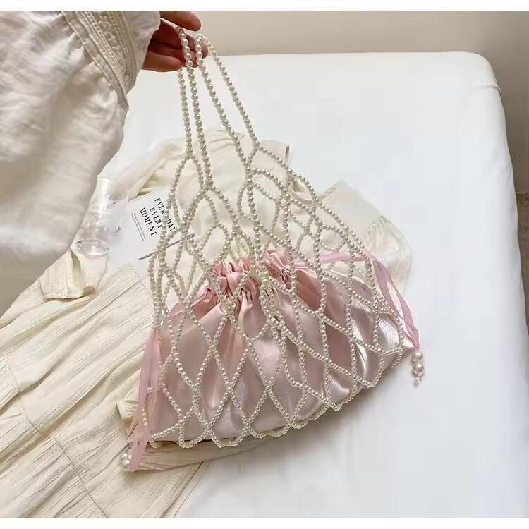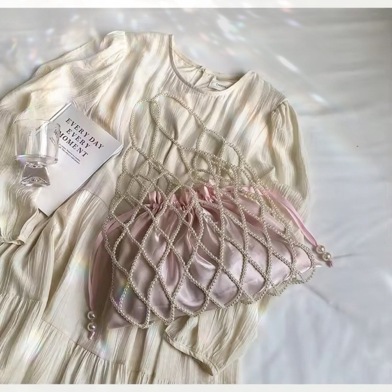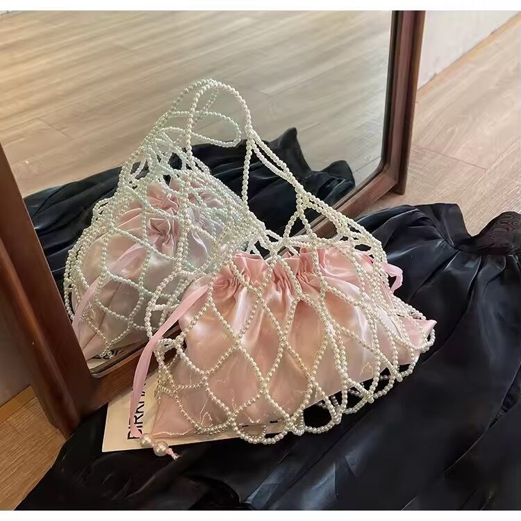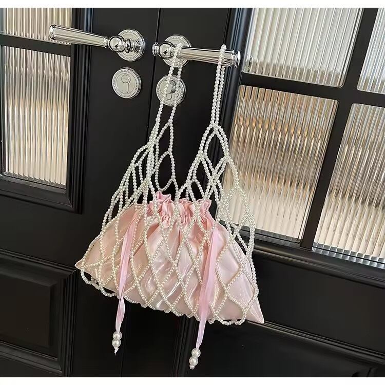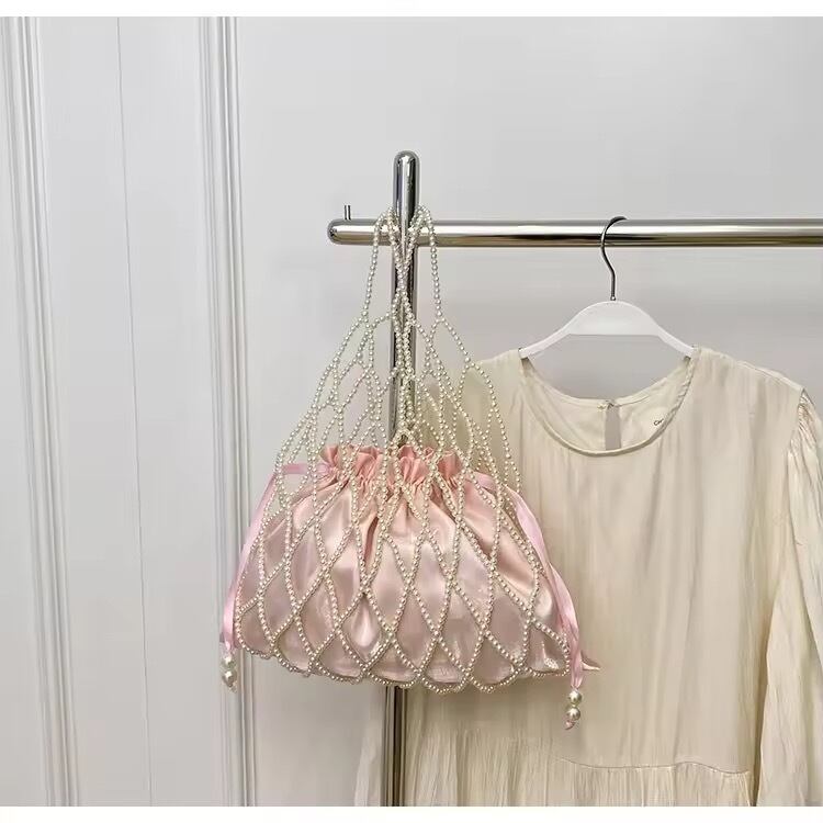 パールバッグ/巾着ポーチ付き/ネットバッグ/ショルダーバッグ/大人フェミニン/オールシーズンバッグ/春夏秋冬/軽量バッグ/アレンジ可能/ピンクバッグ/おしゃれママ/大人可愛い/ギフトバッグ/韓国風ファッション/巾着バッグ