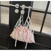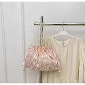 上品な光沢を放つパール編みのネットに、くすみピンクの巾着ポーチを合わせた2WAYバッグ。