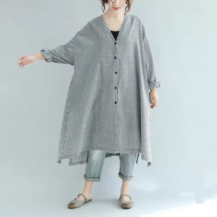 360度美人。羽織にもなるルーズなギンガムチェックロングシャツワンピースフリープラスサイズ秋ロングワンピースUV対策 ゆったりサイズ