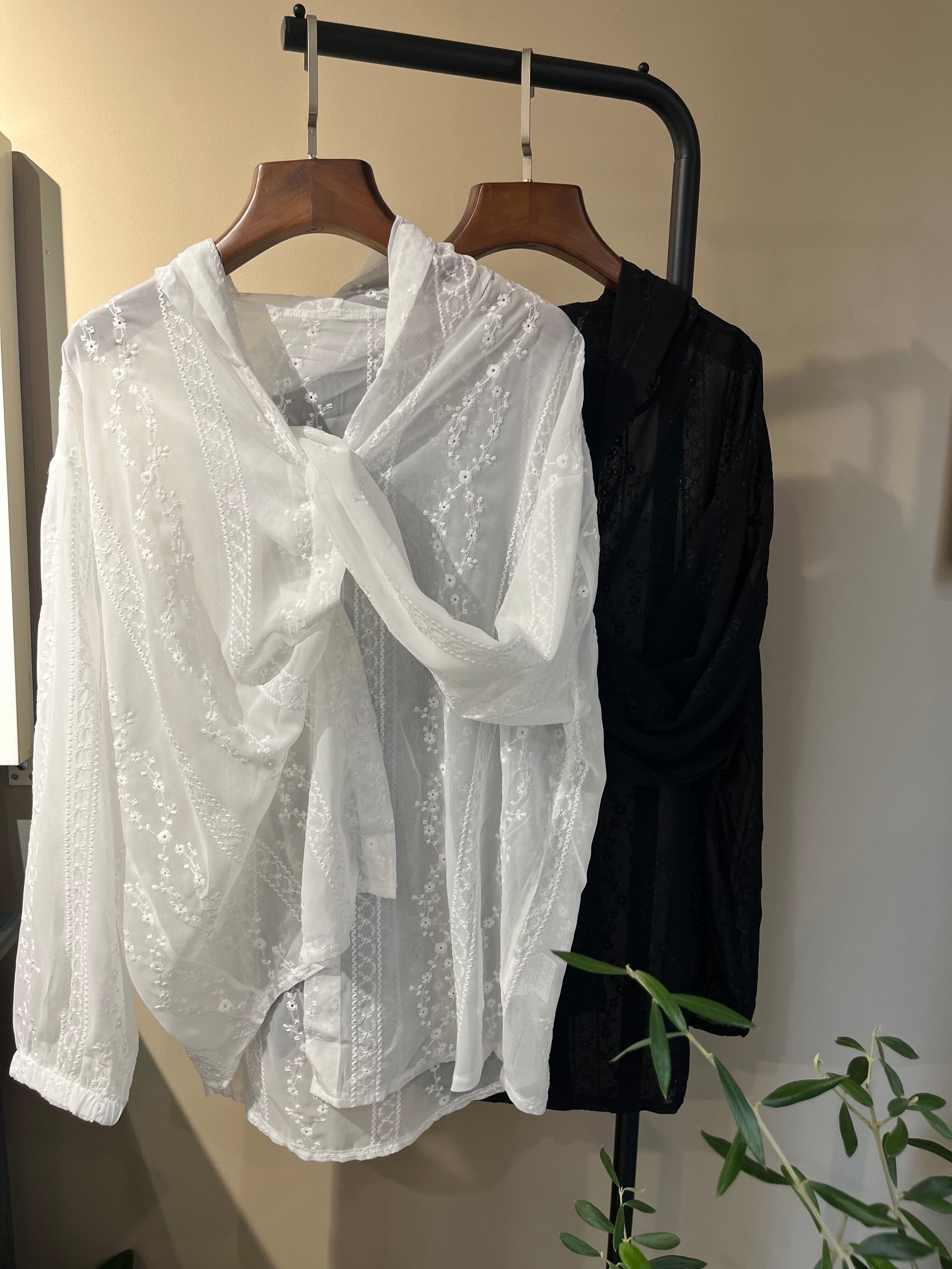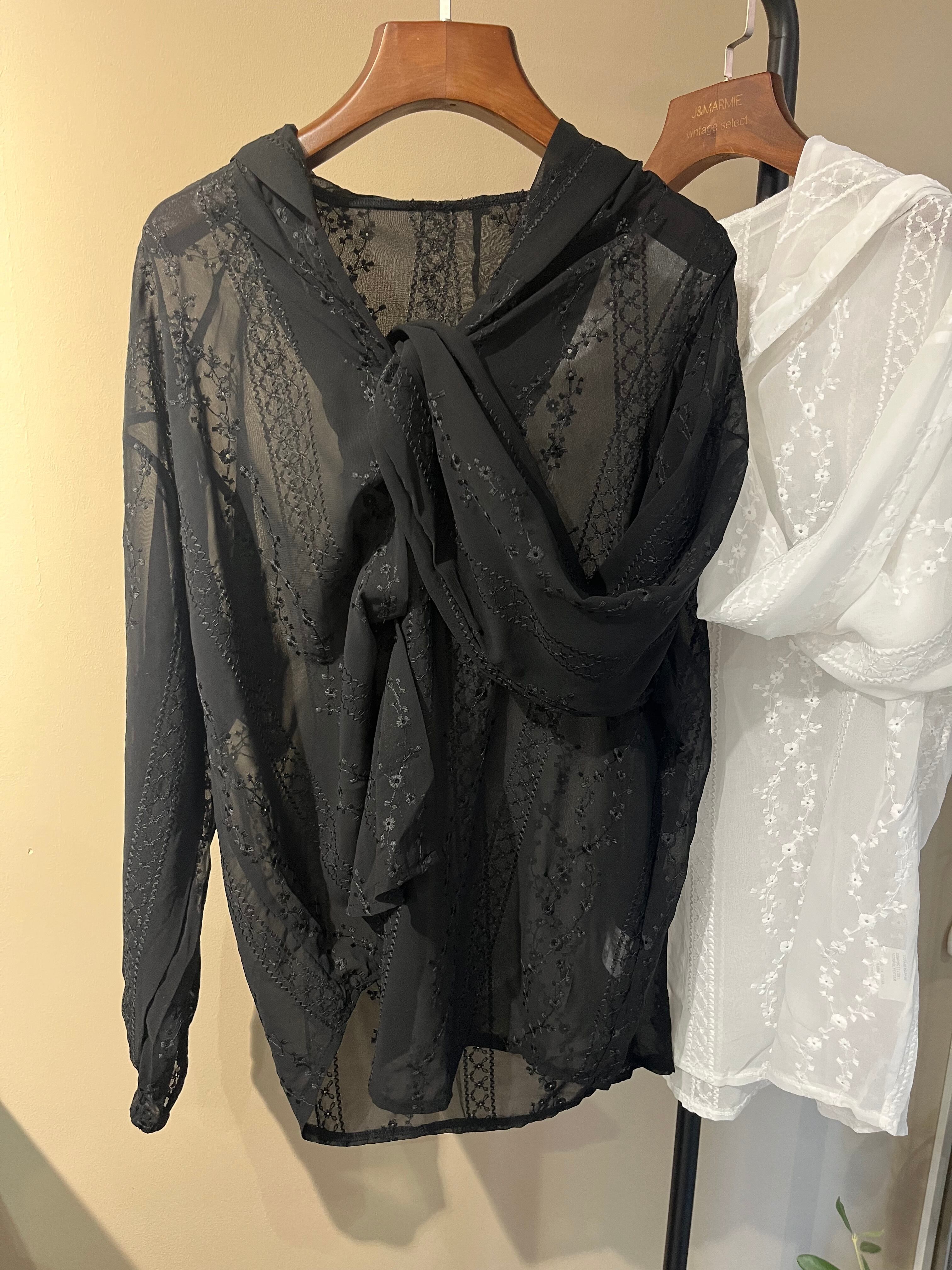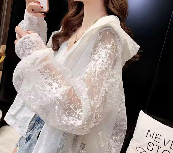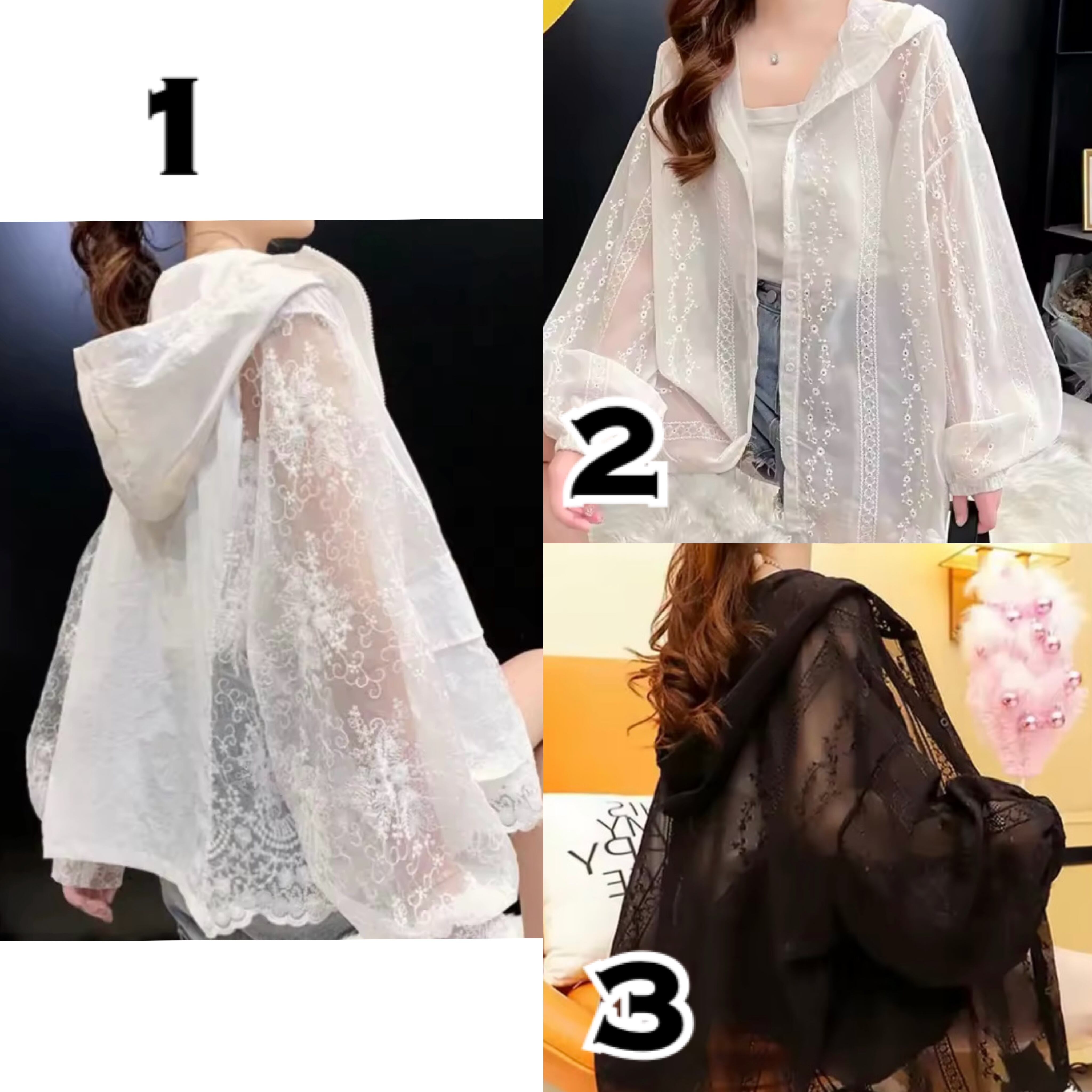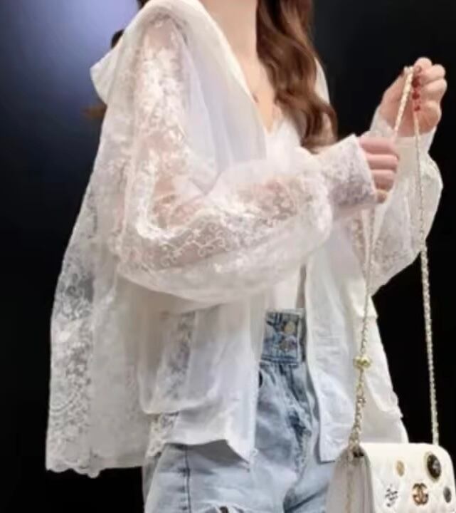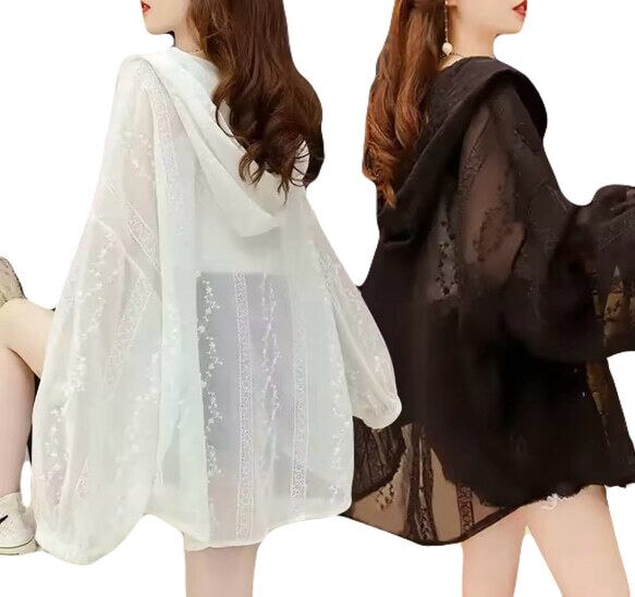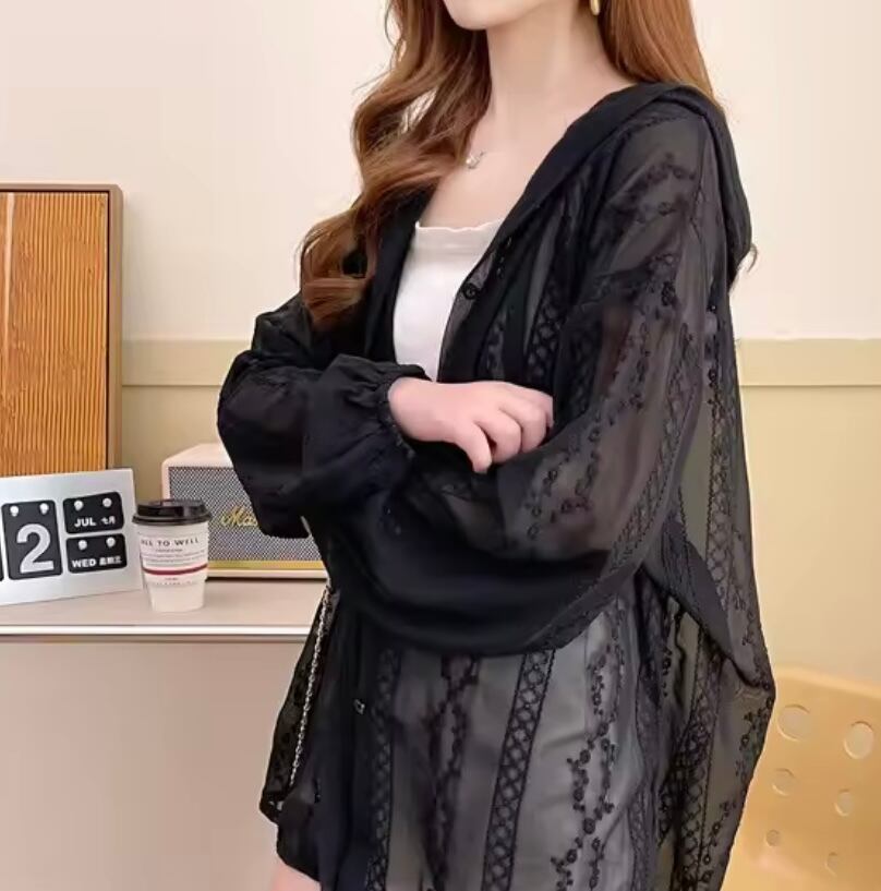 レースパーカー / UVカットパーカー / シアーアウター / フード付き / 薄手羽織 / 体型カバー / 白パーカー / 黒パーカー / 紫外線対策 / ガーリーカジュアル / 春夏アウター / フェスコーデ / 旅行服 / おしゃれ羽織り / ゆったりシルエット / レディースパーカー