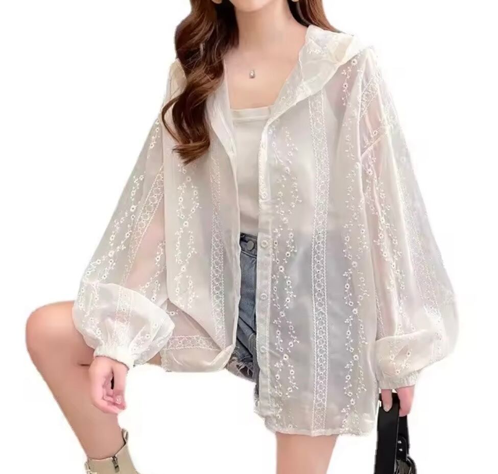 UVカットとおしゃれを両立する、軽やかなレース素材のフード付きパーカー。