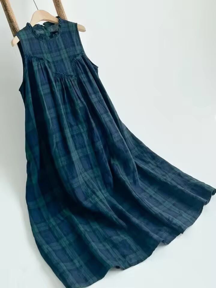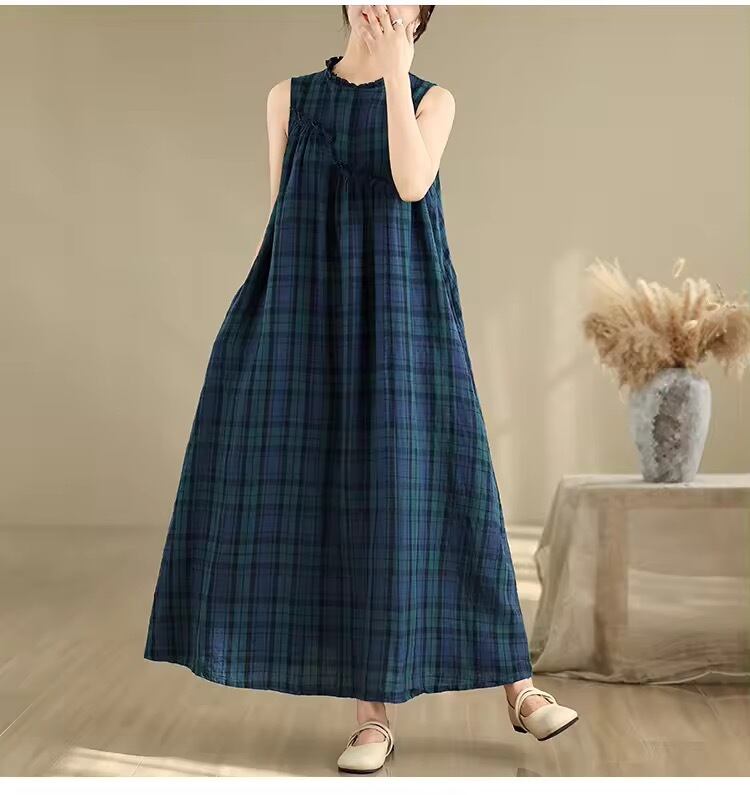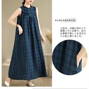 リネンワンピース/ノースリーブワンピース/チェック柄ワンピース/夏ワンピース/体型カバー/大人可愛い/涼しいワンピース/秋まで使える/ナチュラルコーデ/ゆったりワンピース