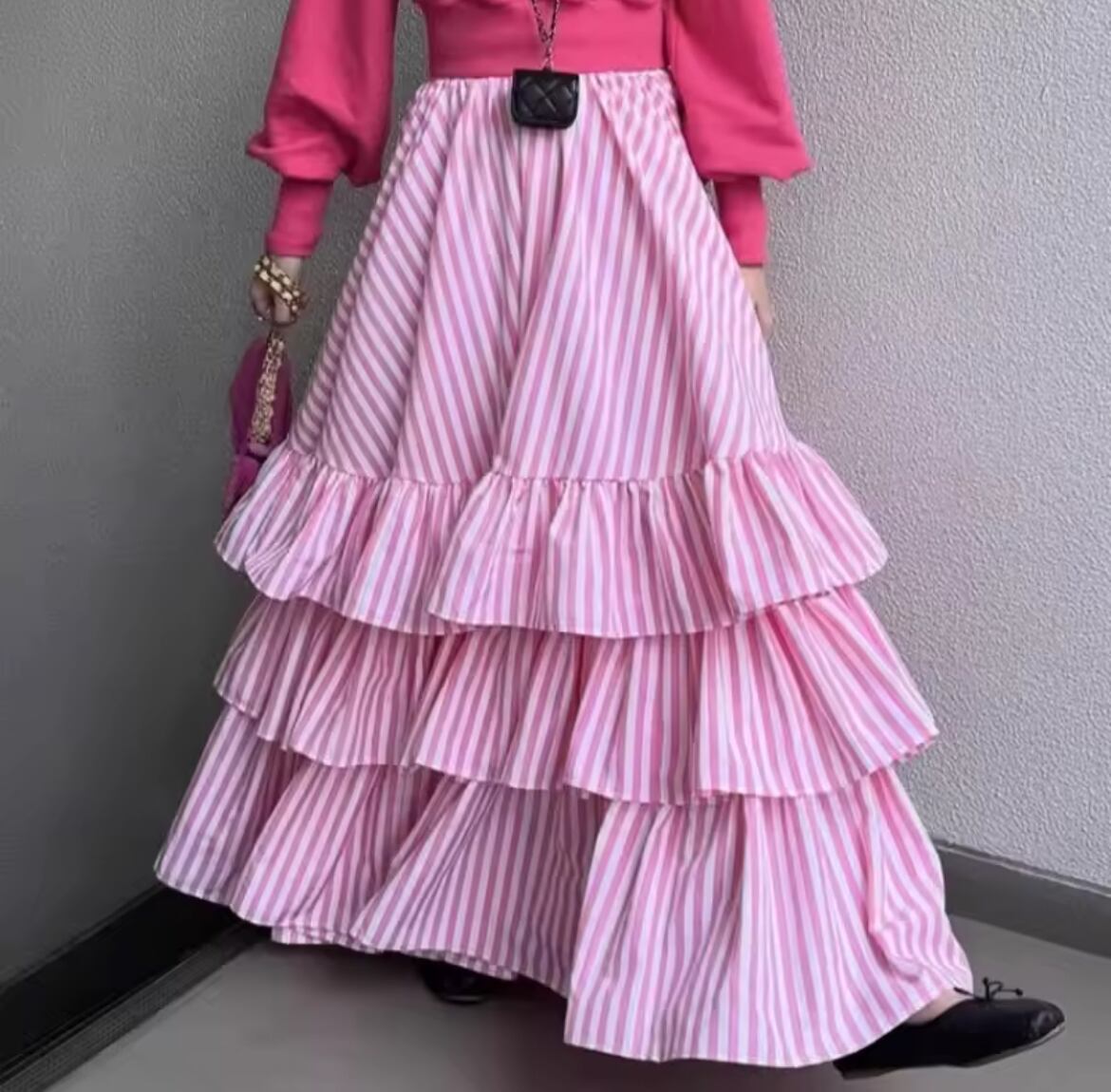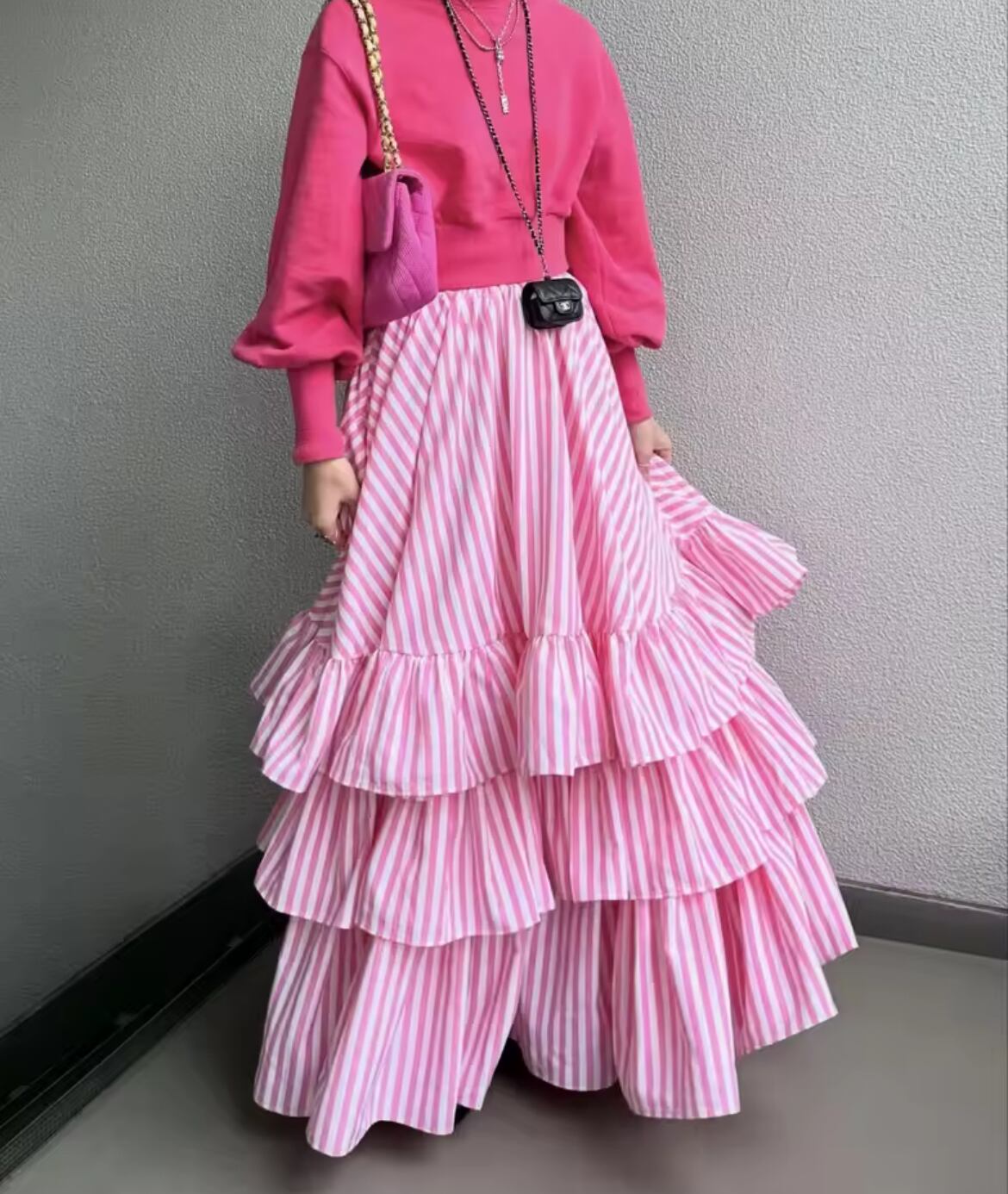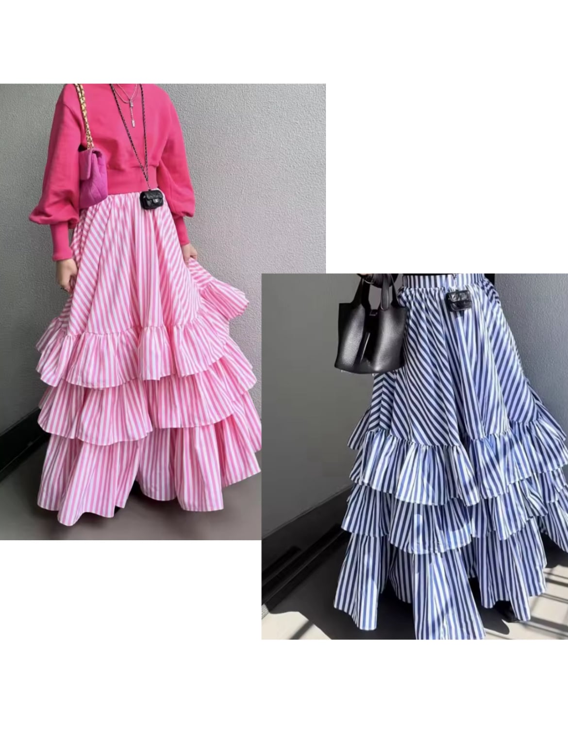ティアードストライプフリルフレアスカート オールシーズン ロングスカート ピンク ブルー フリーサイズ