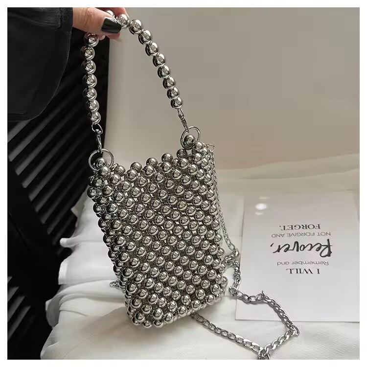 SNSで話題沸騰!光沢のあるパール調&メタル調ビーズを丁寧に編み上げた高見えバッグ。
