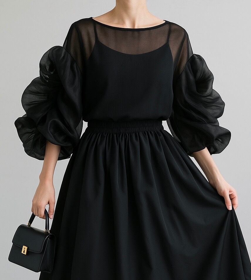 秋冬トップス/プラスサイズ対応/大きいサイズ/福岡ファッション/50代ファッション/60代ファッション/ブラックトップス/フリルスリーブ/収縮性トップス/大人可愛い/唯一無二デザイン/韓国ファッション/福岡レディース