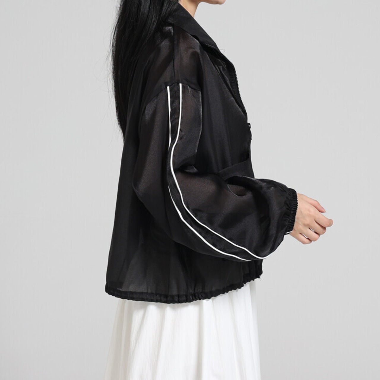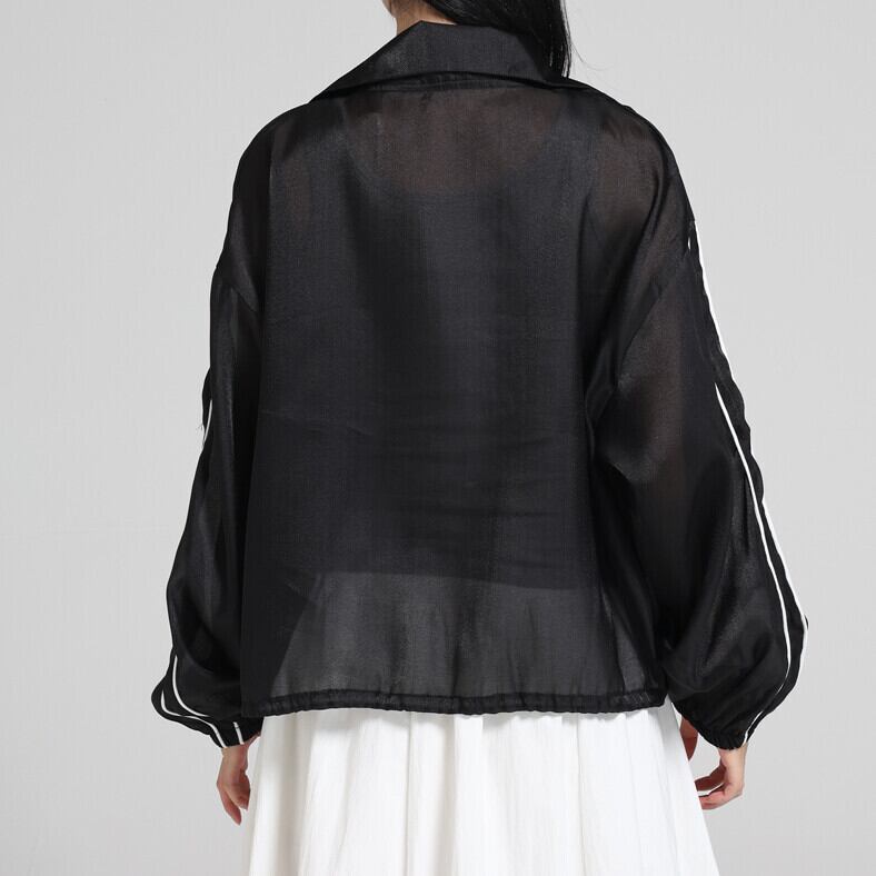 即発送❤︎軽やかシアー素材のジップブルゾン|透け感×光沢が魅力の大人カジュアルライトアウター|ポリエステル|ブラック|春夏秋対応|日よけ・冷房対策にも最適 2025ファッション