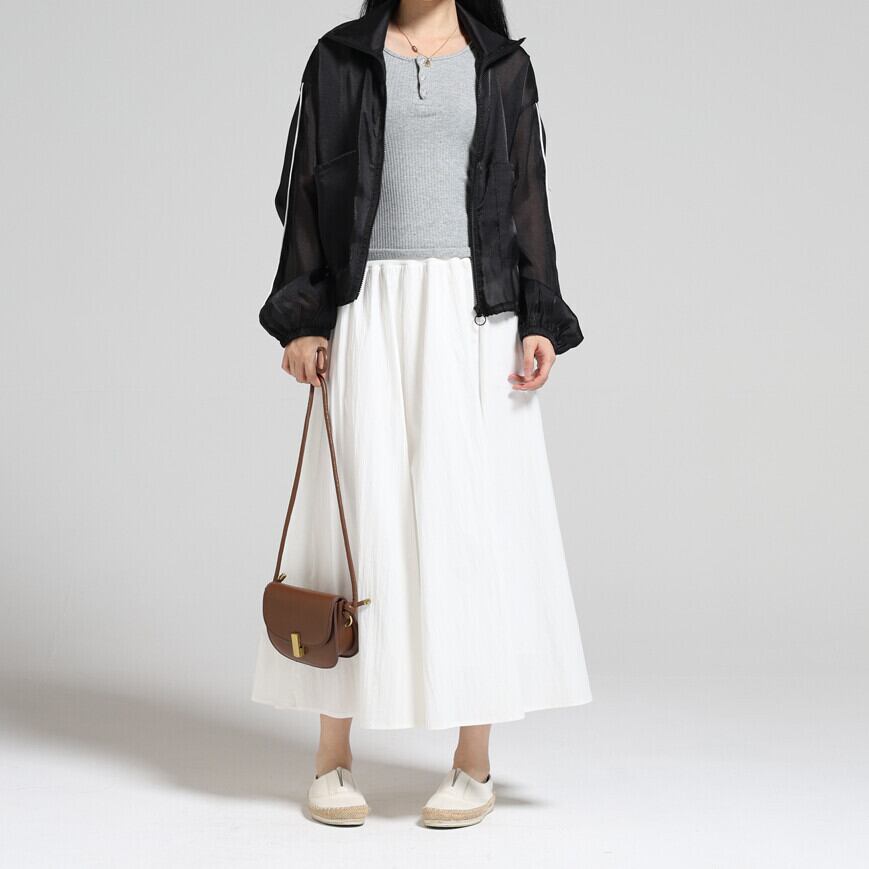 ややショート丈でボトムスを選ばず、羽織るだけで旬のスタイリングが完成。日よけや冷房対策にも便利なライトアウターとしても活躍します。