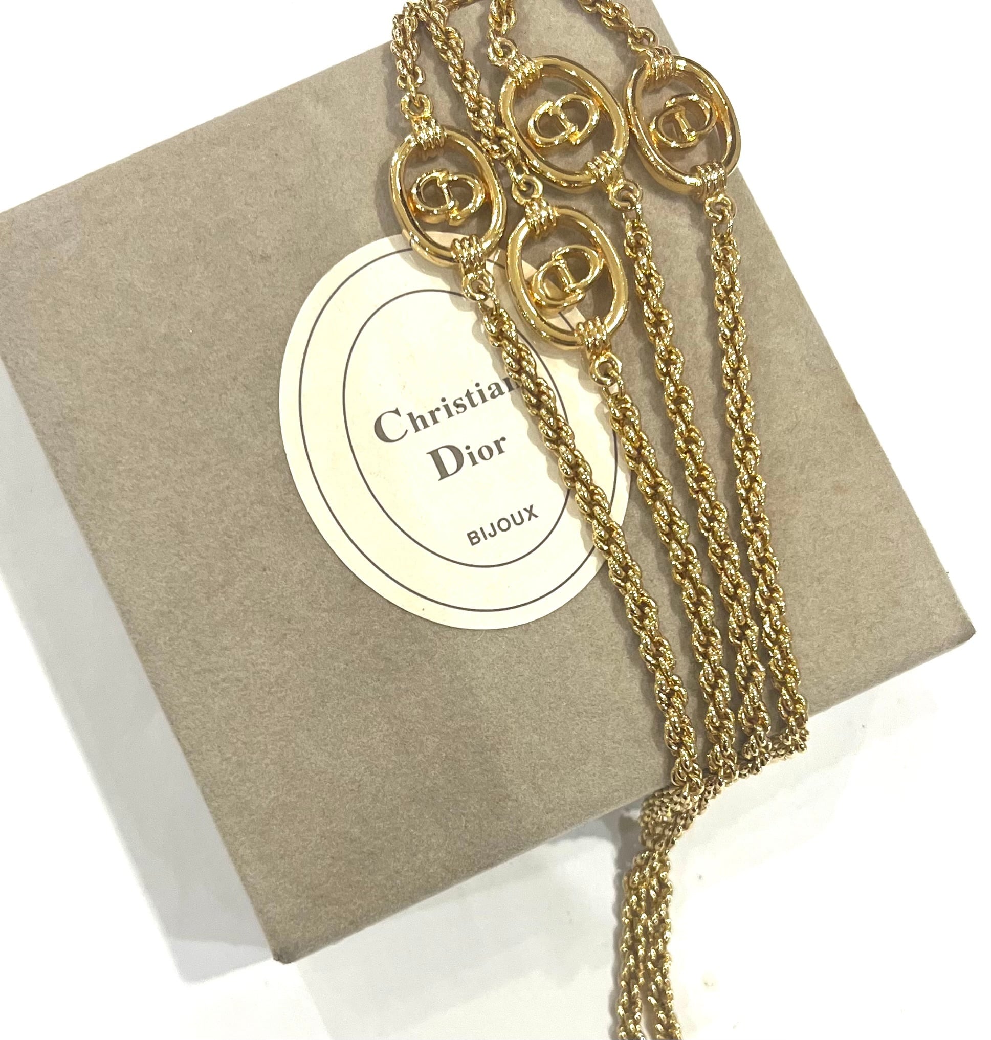 A stunning vintage necklace from Christian Dior, featuring iconic **CD logo charms** along a beautifully twisted **gold-tone chain**.