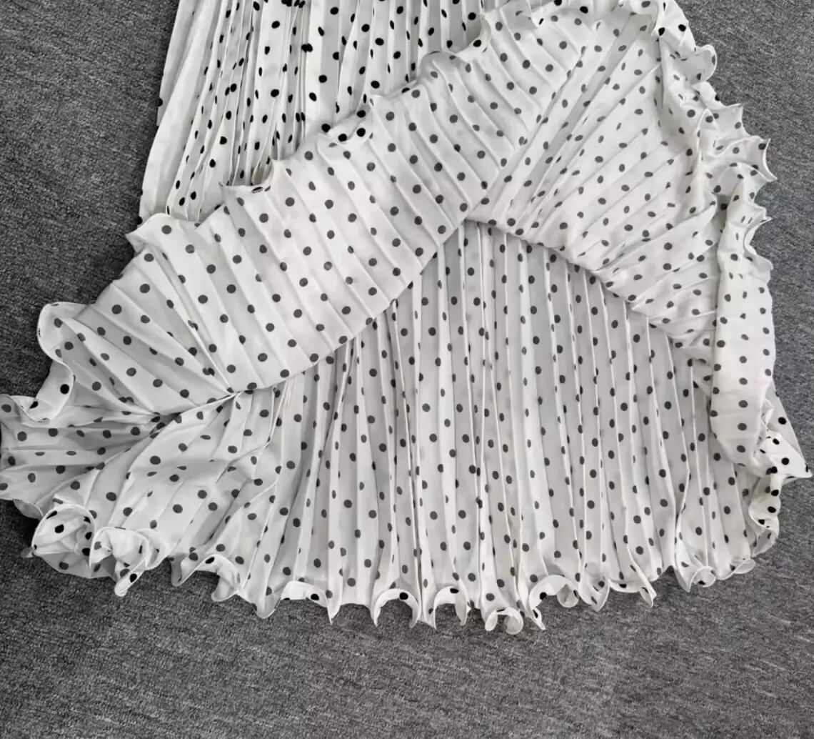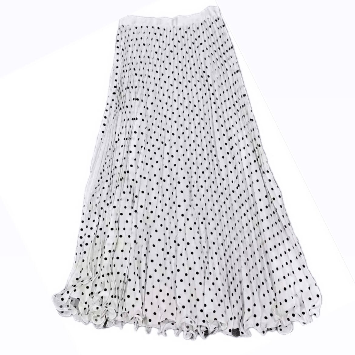 流れるように揺れるプリーツとレトロなドット柄が魅力のロングスカート。