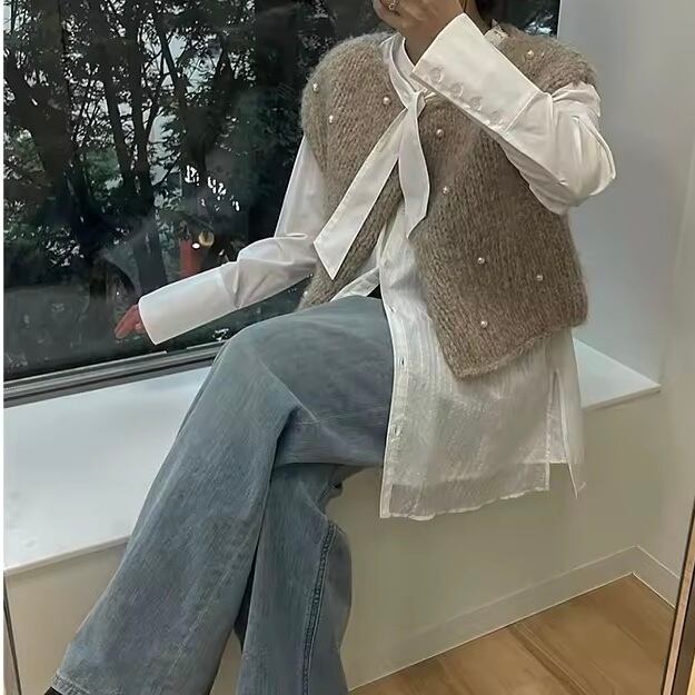 3色【パール付きニットベスト】レディース 秋冬 トップス 重ね着 ふんわり 可愛い パール飾り 大人カジュアル ゆったり ベスト ニットベスト 羽織り ノースリーブ ニット レディースファッション 秋アウター羽織