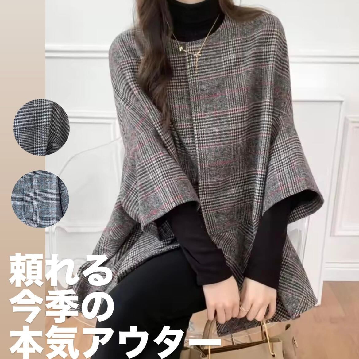 今季マストバイ【ケープポンチョ】グレンチェック柄 アウター レディース 秋冬春まで 長いシーズン着回せる 体型カバー 3色展開羽織アウタートップス