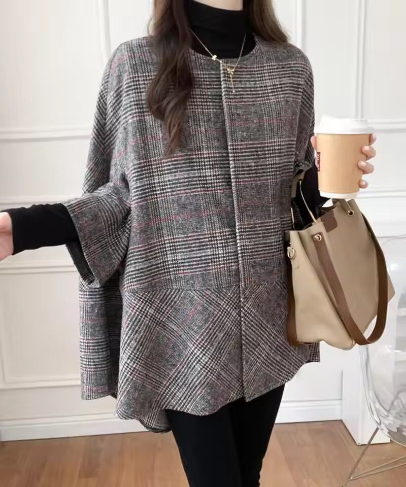 ゆったりとしたシルエットで体型を美しくカバーし、クラシカルなチェック柄が上品さを演出します。軽く羽織るだけでコーディネートが一気に華やぎ、秋冬はもちろん、春先まで長いシーズン楽しめる一枚。