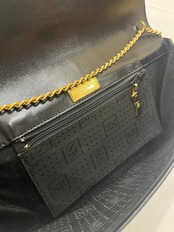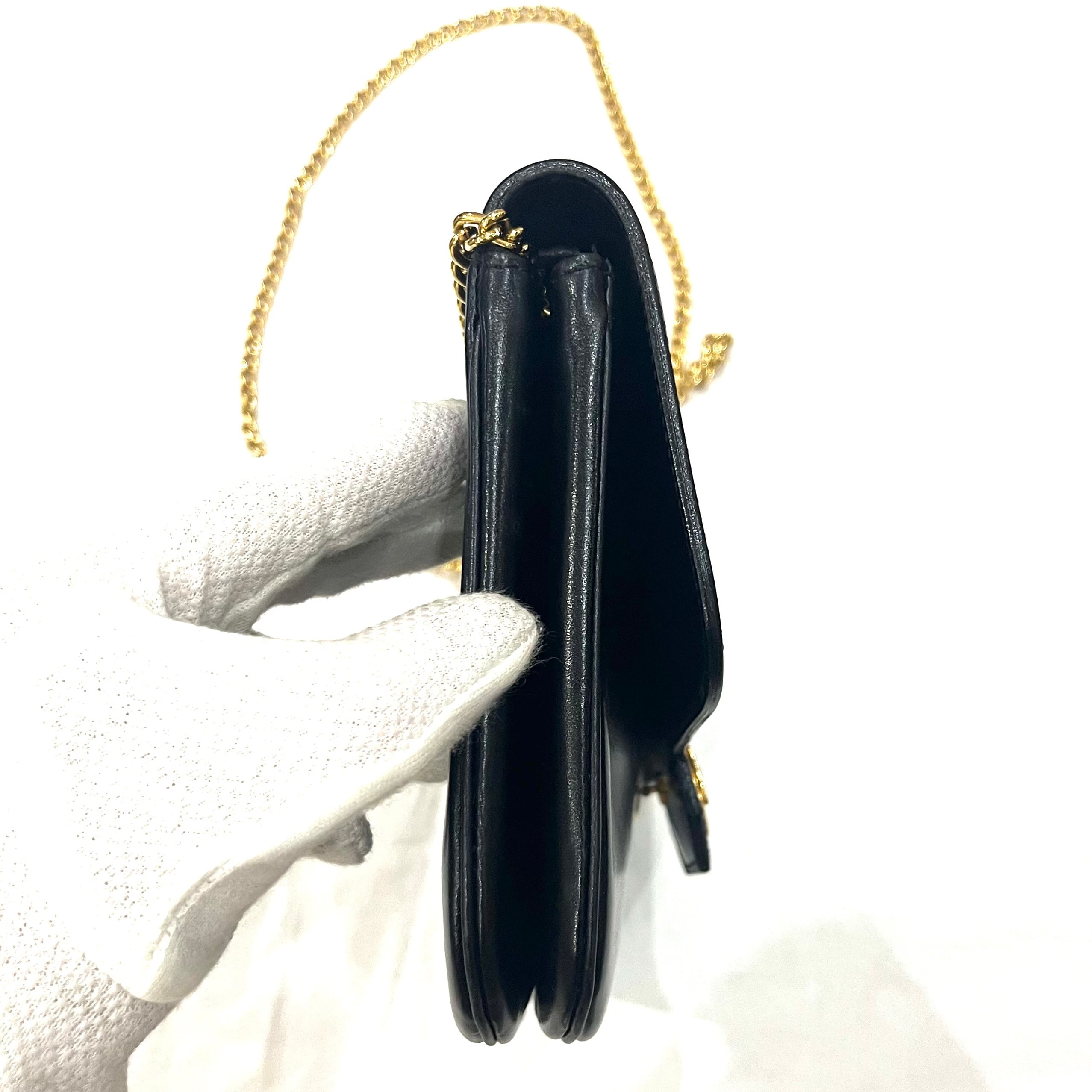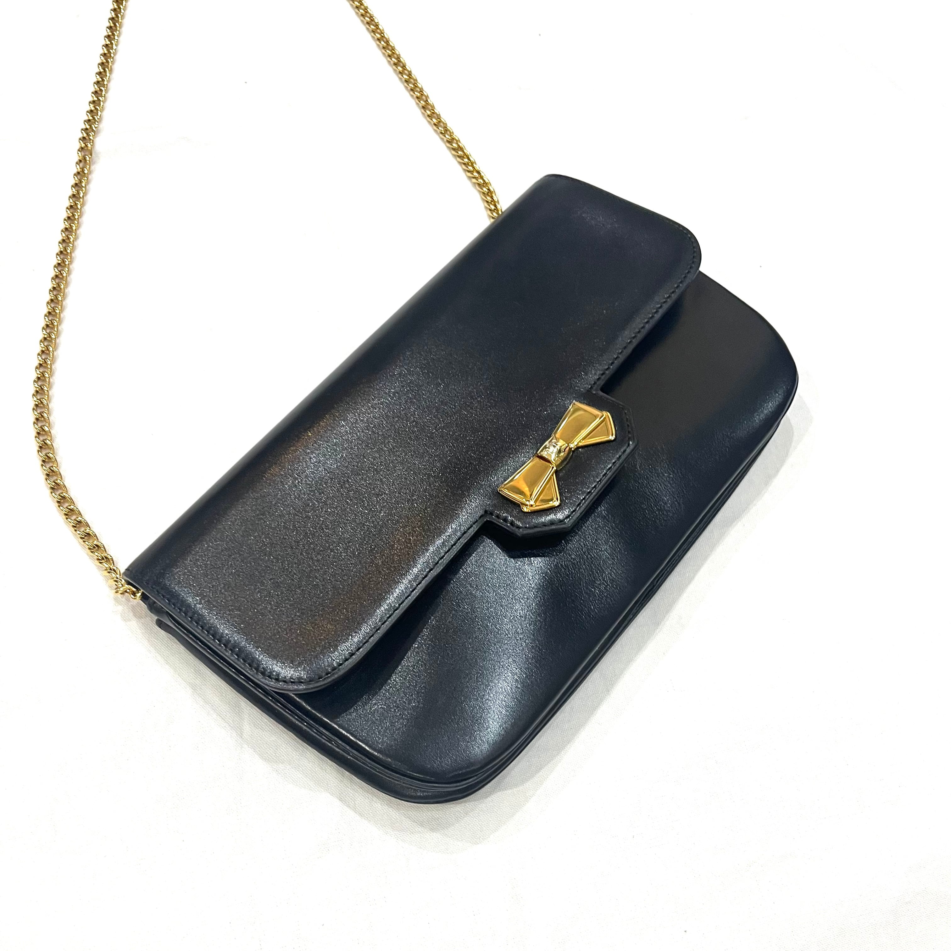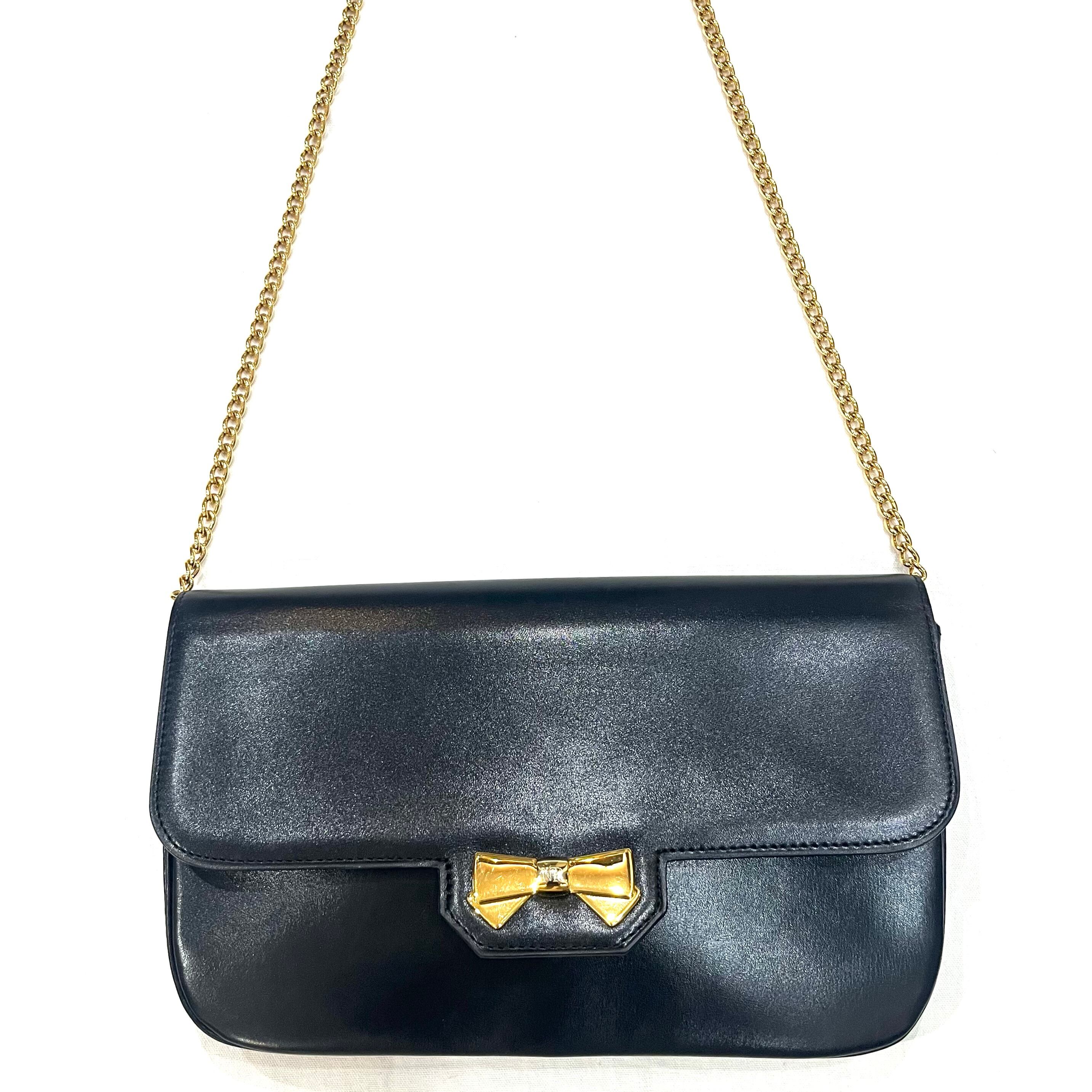 本品はブラックレザーにゴールドのリボン金具を配したショルダーバッグ。気品ある輝きを放つWチェーンは、肩掛け・クロスボディの両方で活躍。必要な荷物をスマートに収められるサイズ感で、フォーマルから日常使いまで幅広く対応可能です。