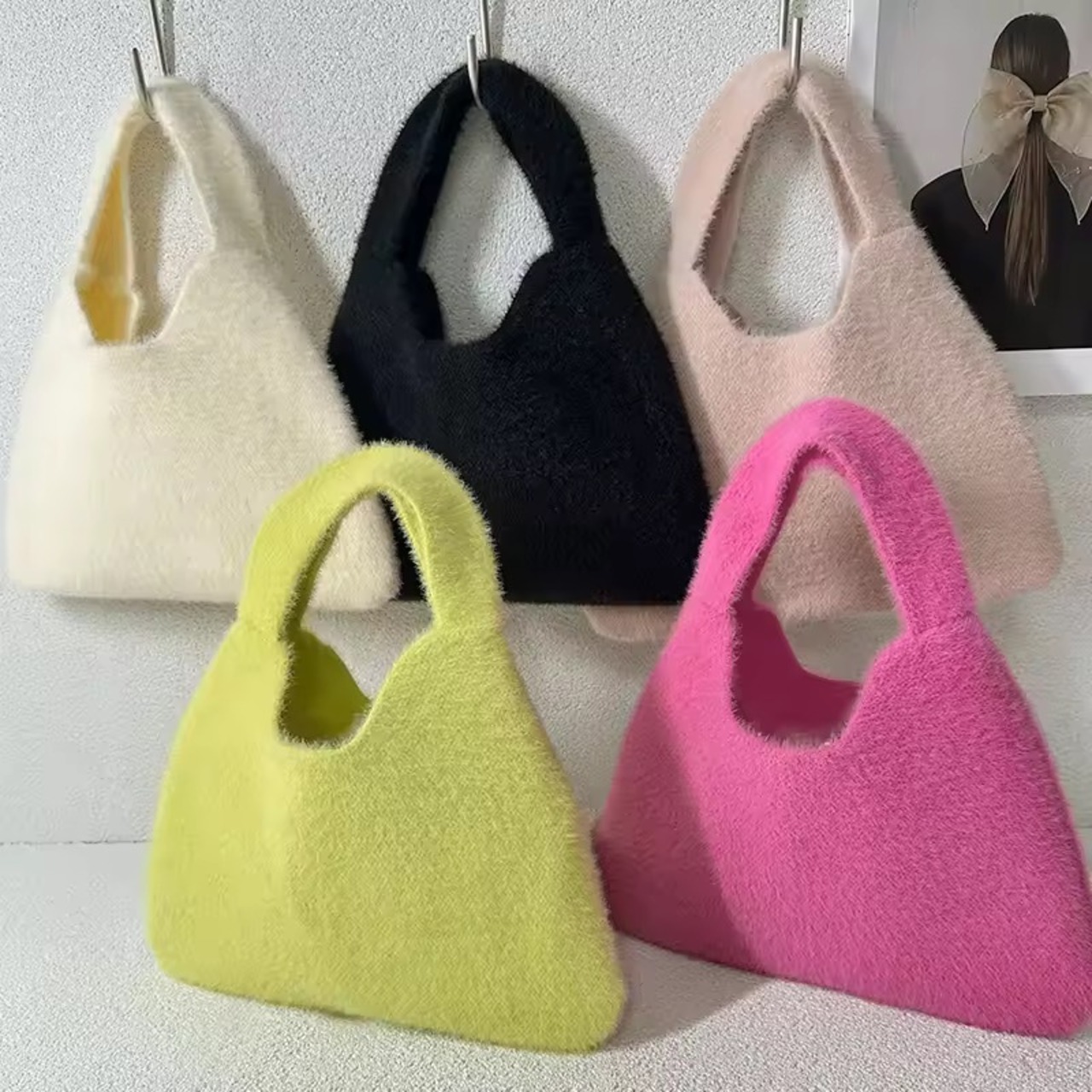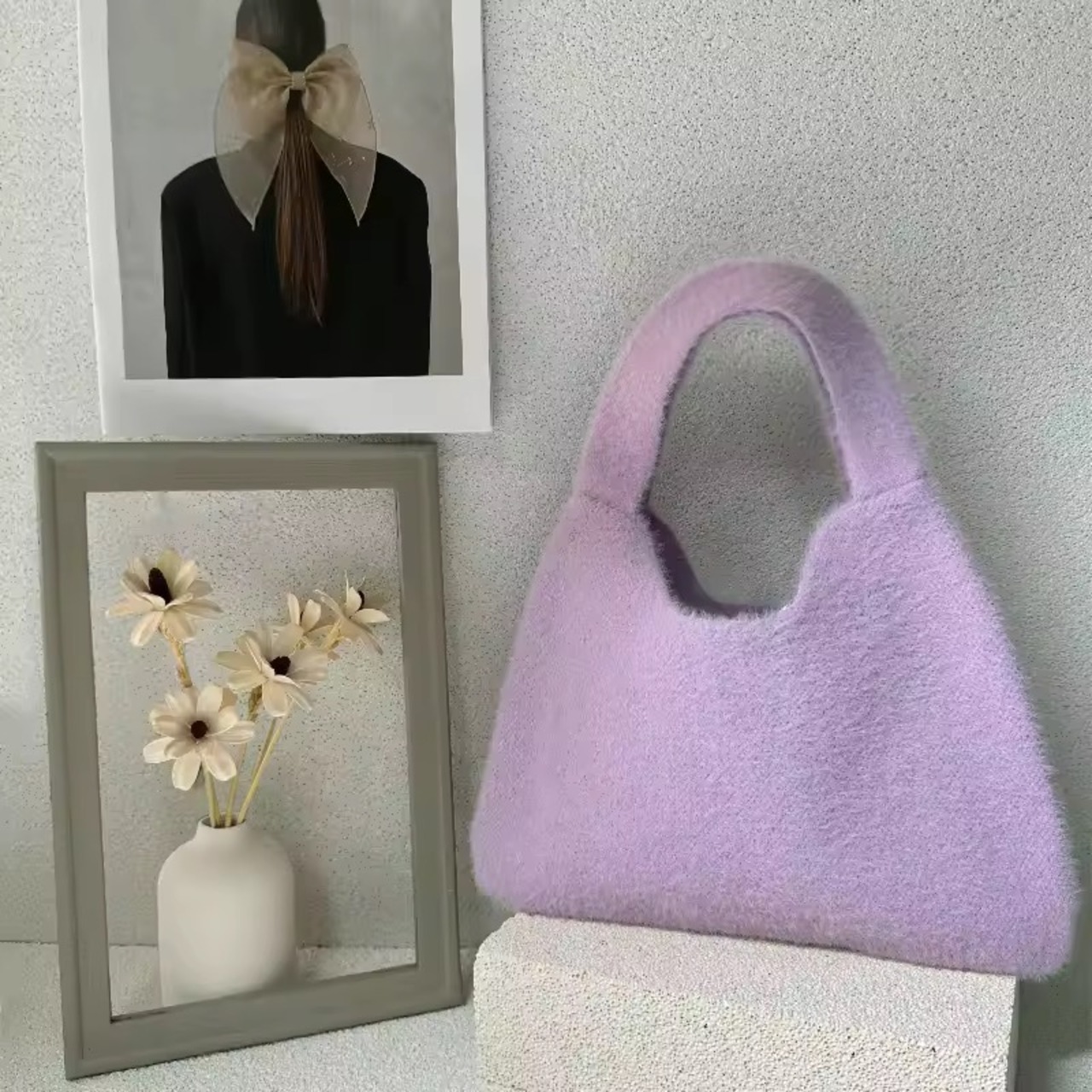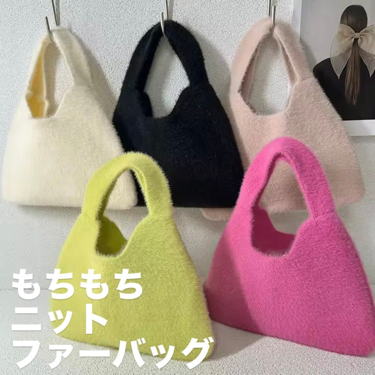 【ふわもこニットトートバッグ Fluffy Charm】マカロン秋冬コーデを格上げするミニショルダー/レディース モコモコ バッグjapan エコバッグファーバッグ