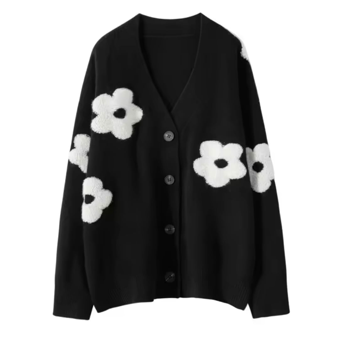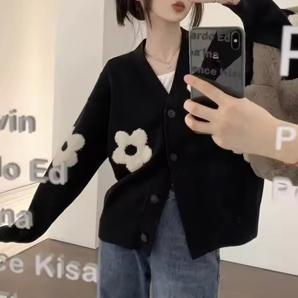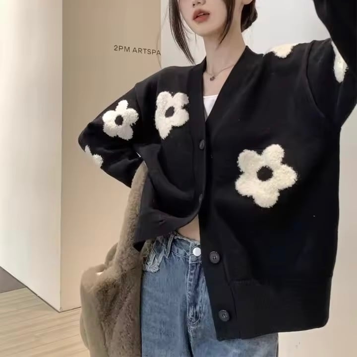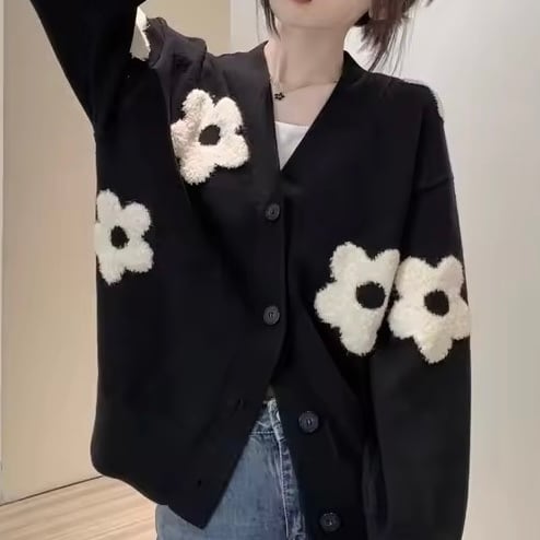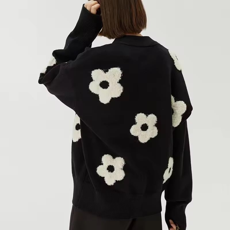 シンプルな黒地に映えるホワイトの花が、着こなしを一気に華やかに。デニムやスカートにも合わせやすく、秋冬コーデにぴったりです。ゆったりとしたシルエットで体型カバーも叶います。