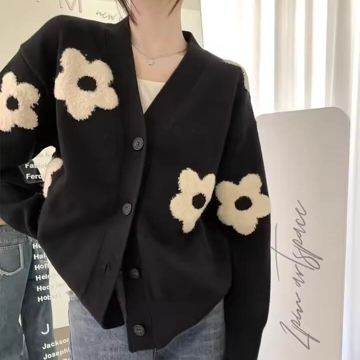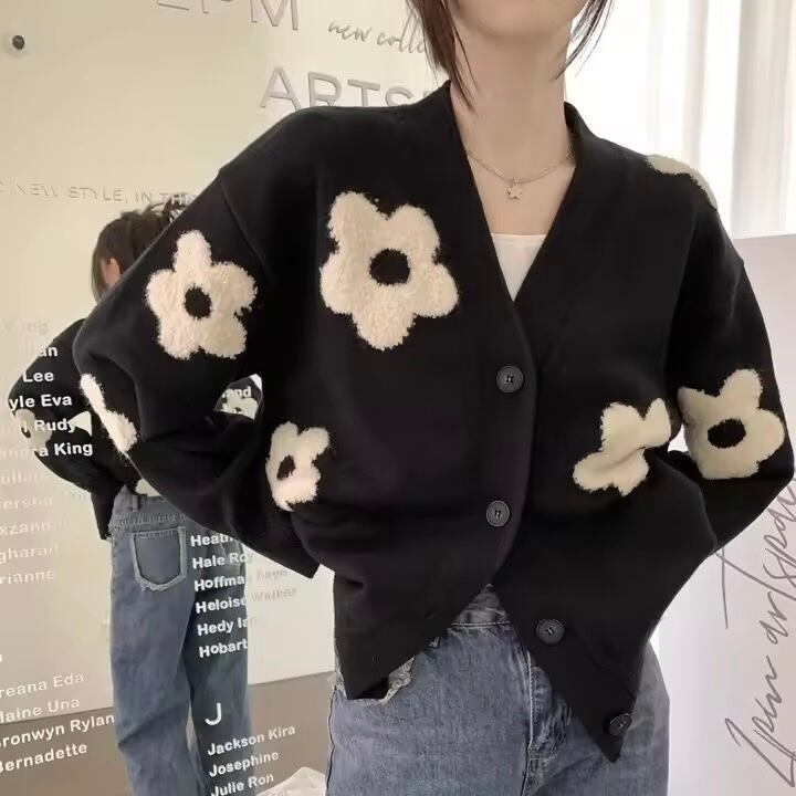 カーディガン レディース/花柄 カーディガン/秋冬 ニット 羽織/大きめサイズ カーディガン/ゆったり カーディガン/ブラック カーディガン レディース
