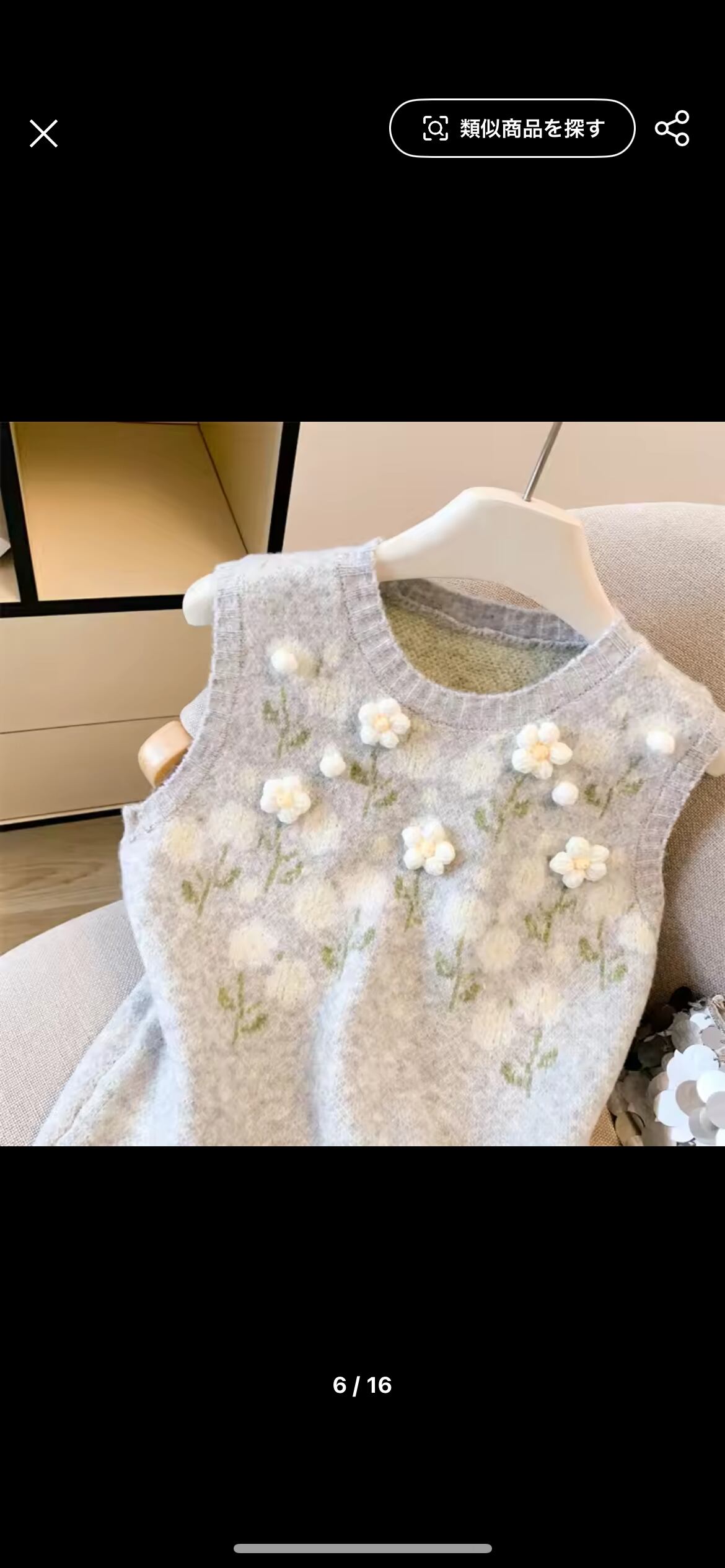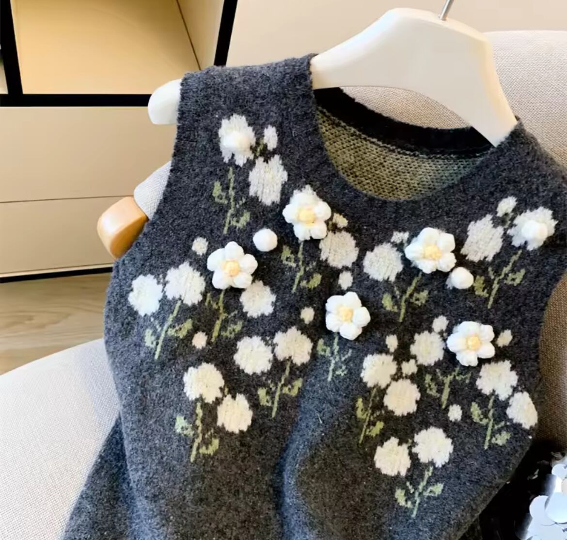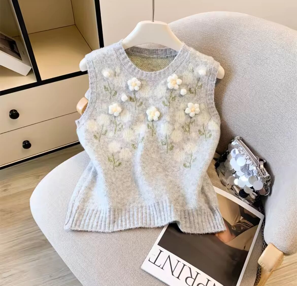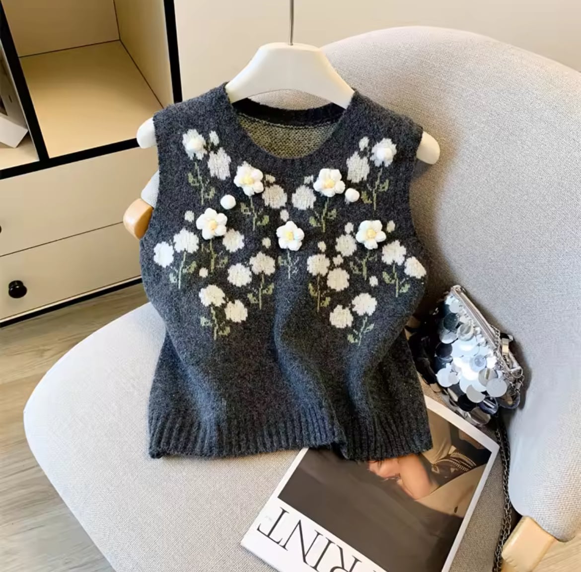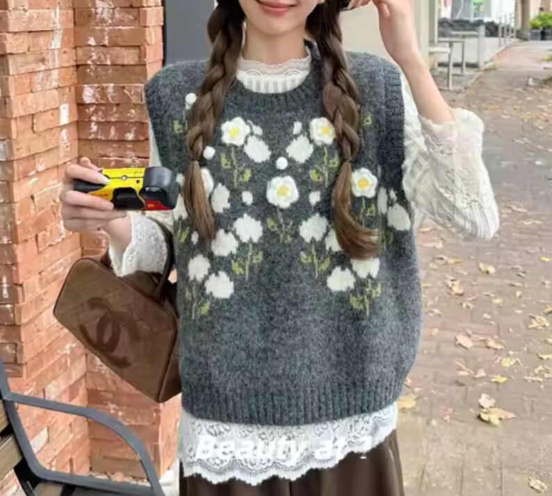もこもこフラワーデザインニット ニット トップス 秋冬 花 ベスト 秋冬コーデ 可愛い ファッション 重ね着