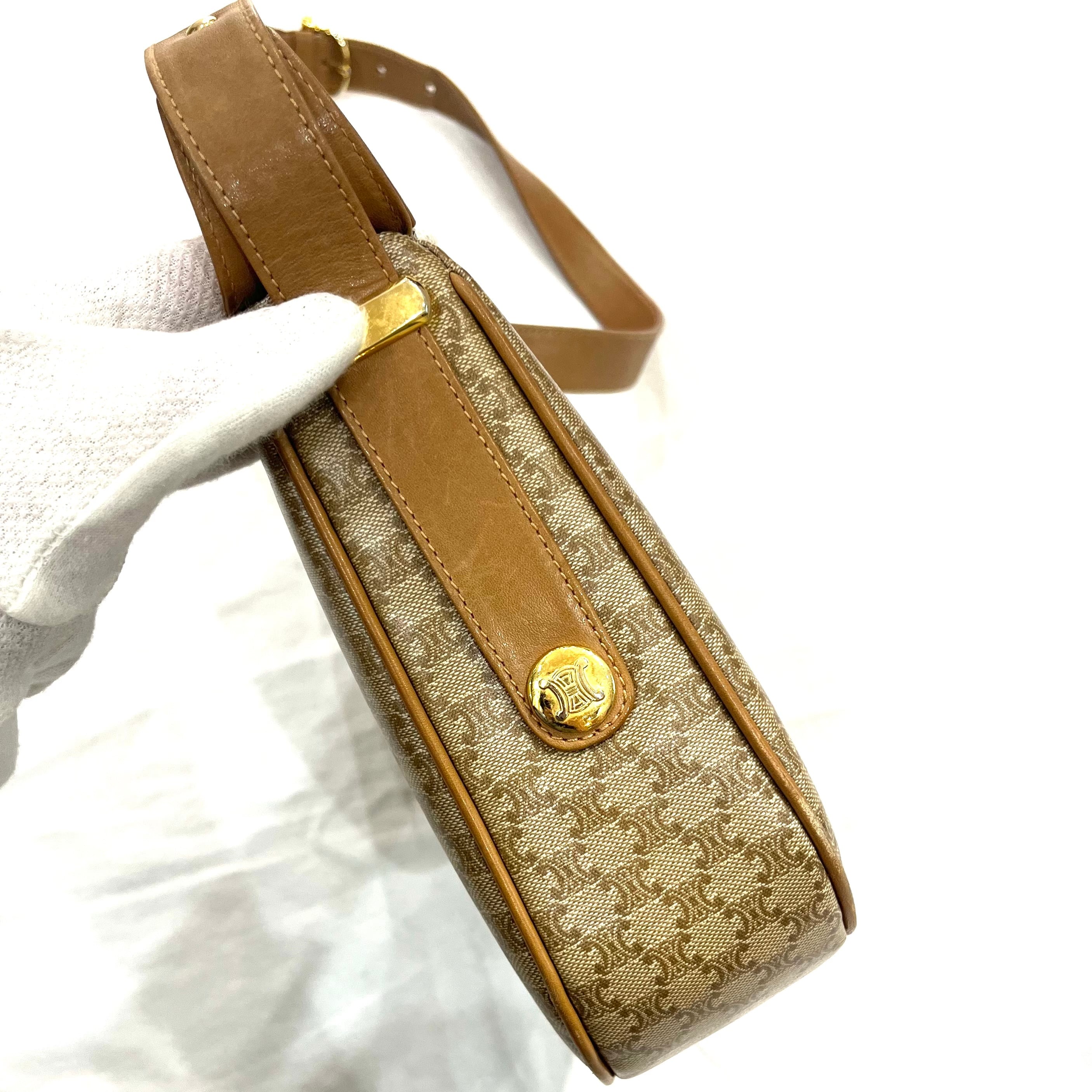 【CELINE】1906 マカダム柄ショルダーバッグ/ブラゾン金具/ベージュ×キャメル/ヴィンテージ オールドセリーヌ サルキー ハーフムーン 斜めがけ パターン柄