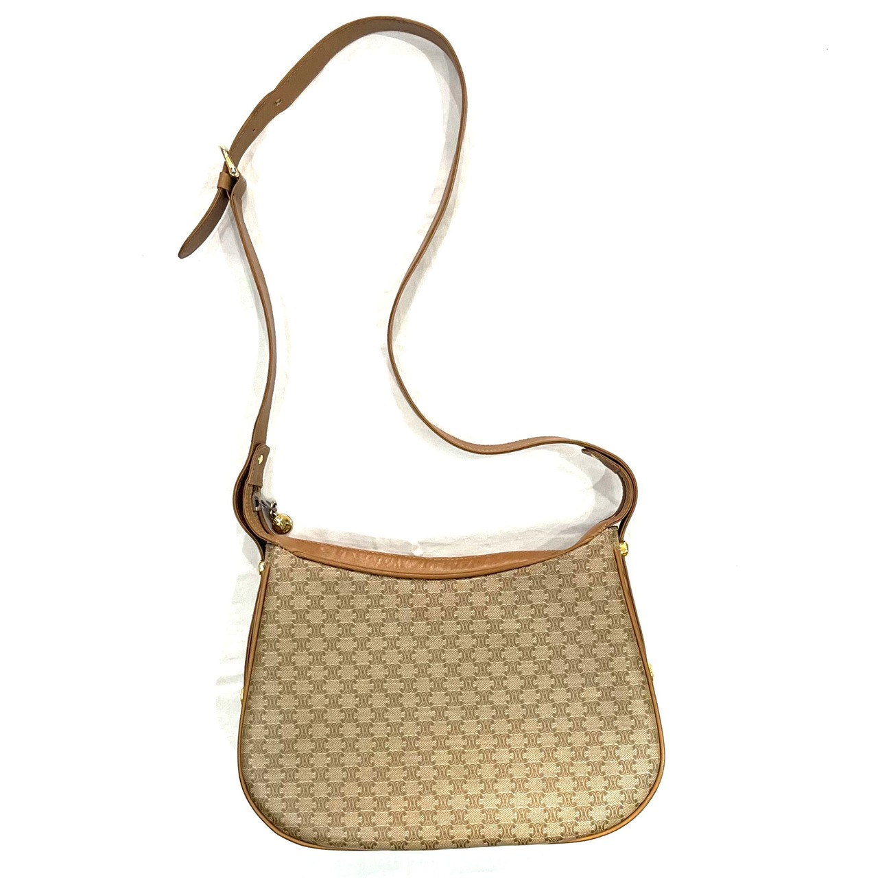 【CELINE】1906 CELlNE マカダム柄ショルダーバッグ/ブラゾン金具/ベージュ×キャメル/ヴィンテージ オールドセリーヌ サルキー ハーフムーン 斜めがけ パターン柄 オールドセリーヌ福岡