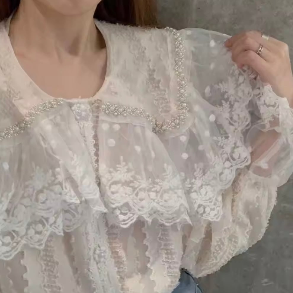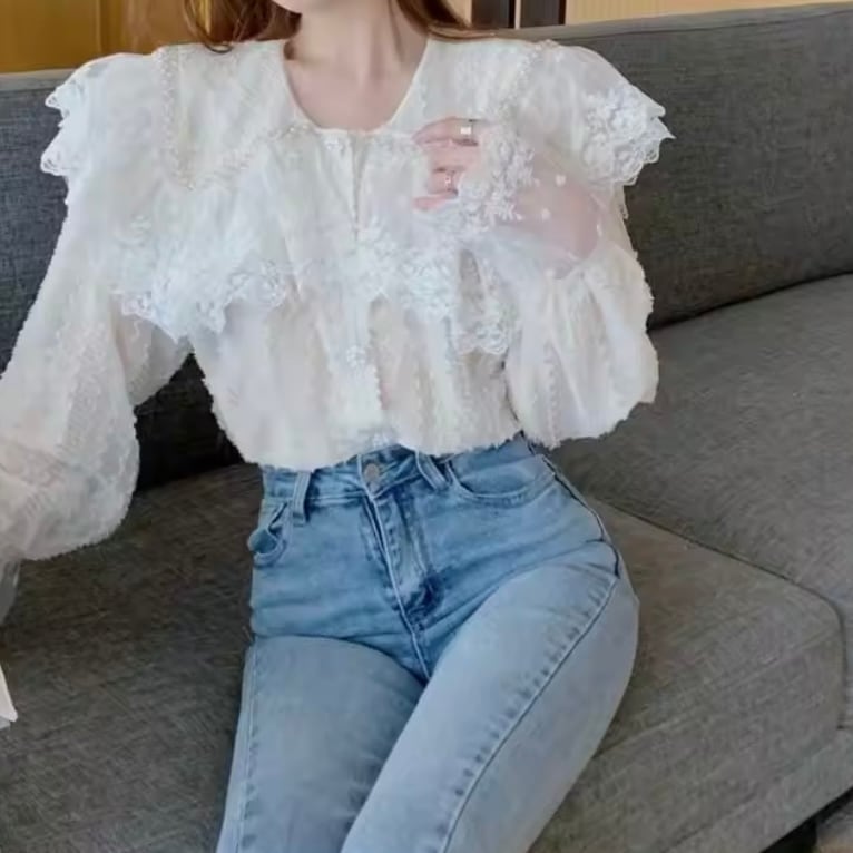 レースブラウス / フリルブラウス / シアーブラウス / フェミニントップス / 透け感ブラウス / 秋冬トップス / 大きめ襟 / 韓国ファッション / きれいめカジュアル / 体型カバー