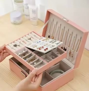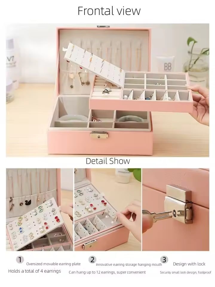 上品なPUレザーを使用した、2層式の高級ジュエリーボックス。