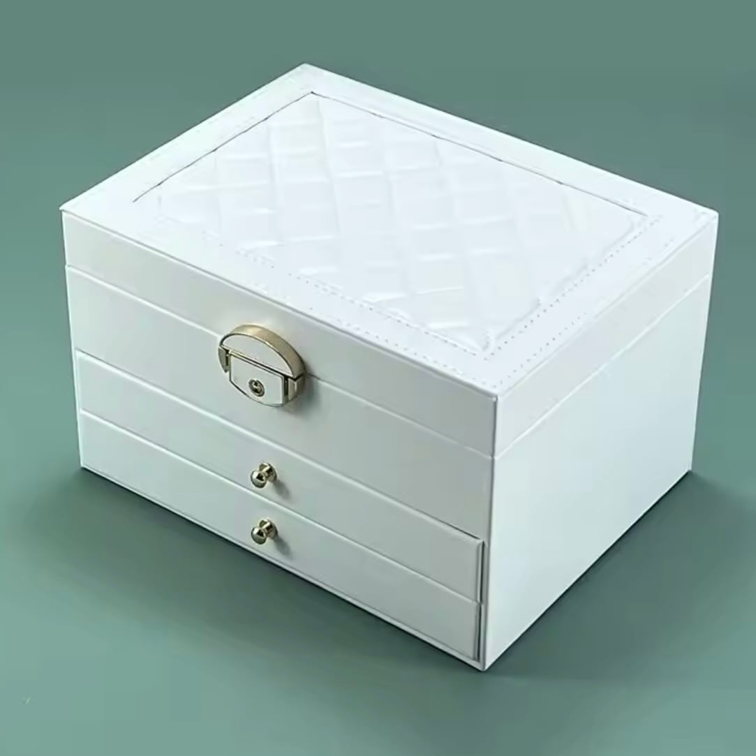 【ジュエリーボックス】大容量3段収納/鍵付きレザー調アクセサリーケース/見せる収納で上質インテリアに/ピアス・リング・ネックレス整理/プレゼントにも最適