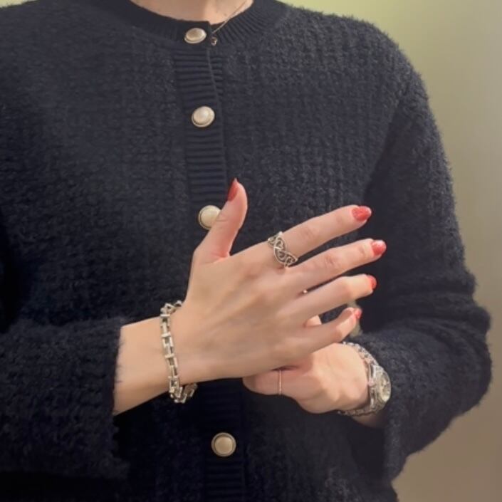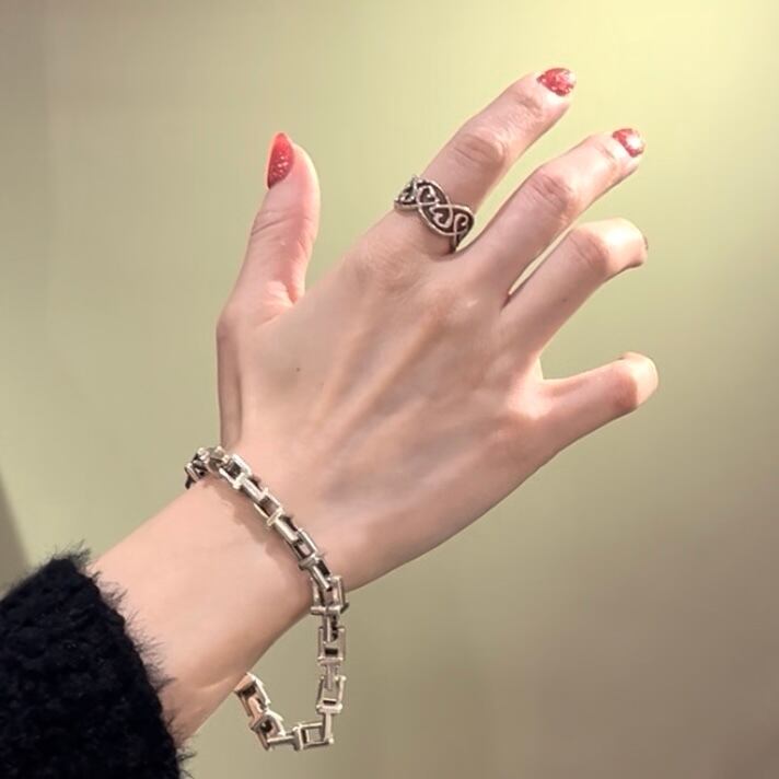 連続したラビングハートを立体的に組み上げたデザインは、透け感がありながらも幅広で存在感があり、手元に確かな印象を残します。