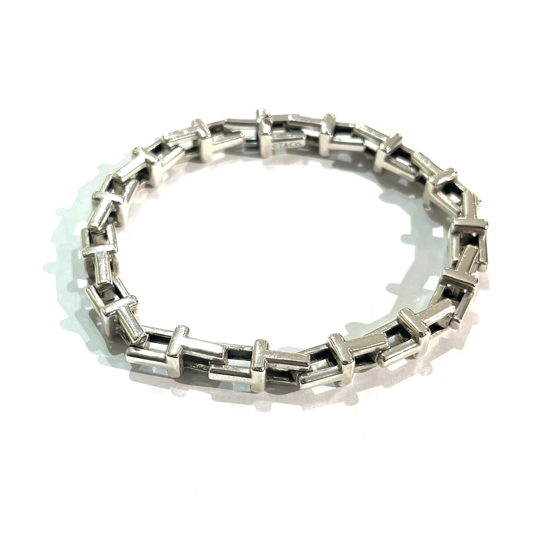 ティファニーのアイコニックな“T”が連なった、モダンで洗練されたデザインのシルバーブレスレットです。