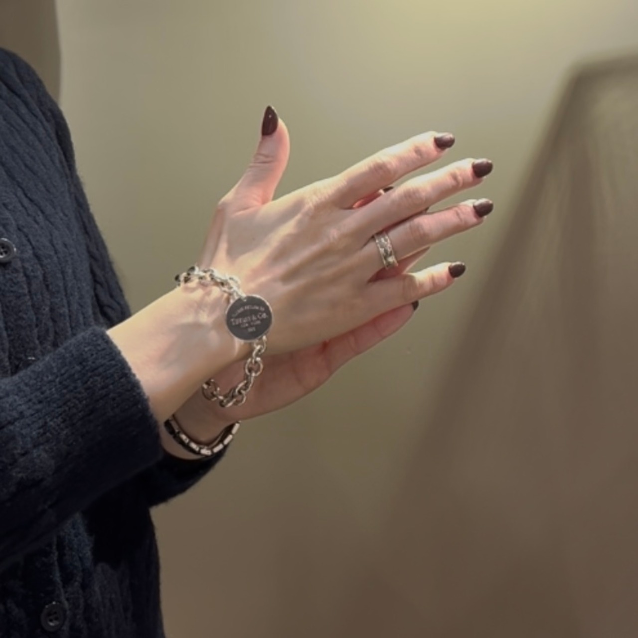 直径2.3cmの丸タグが存在感を放ち、シルバー925の上質な輝きが手元を華やかに引き立てます。
