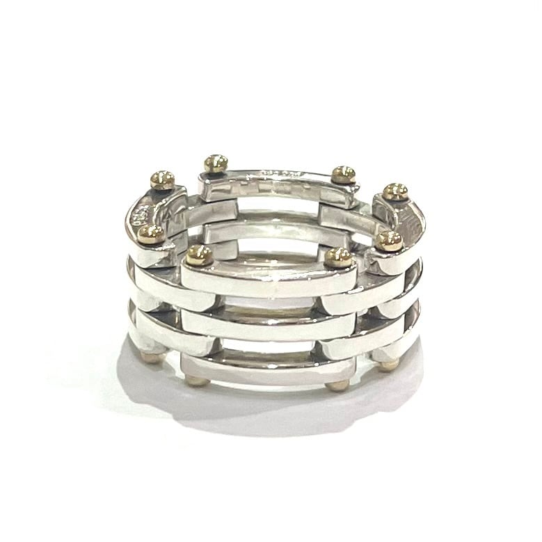 立体的に組まれたシルバー925の構造に、18Kゴールドのスタッズが規則的に配された、非常に印象的なデザインです。