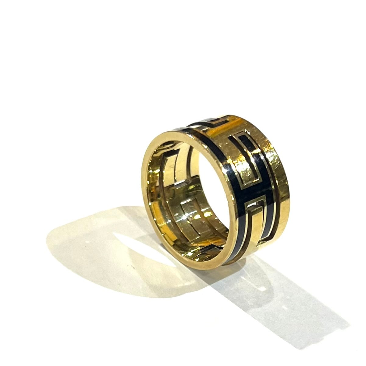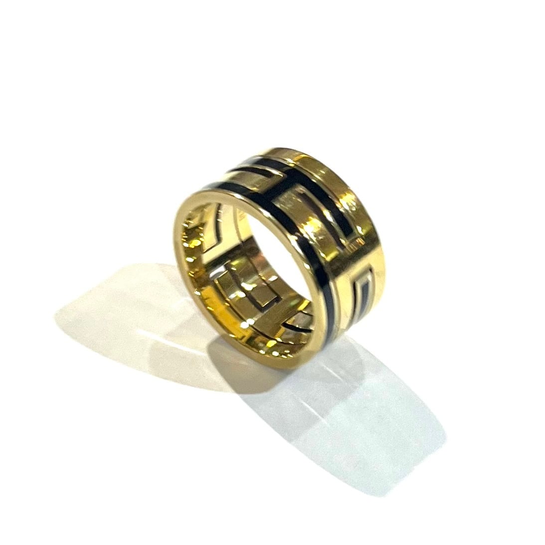 表面は光沢のあるゴールドプレート、ブラックのラインが全体を引き締め、指元に立体感を生みます。