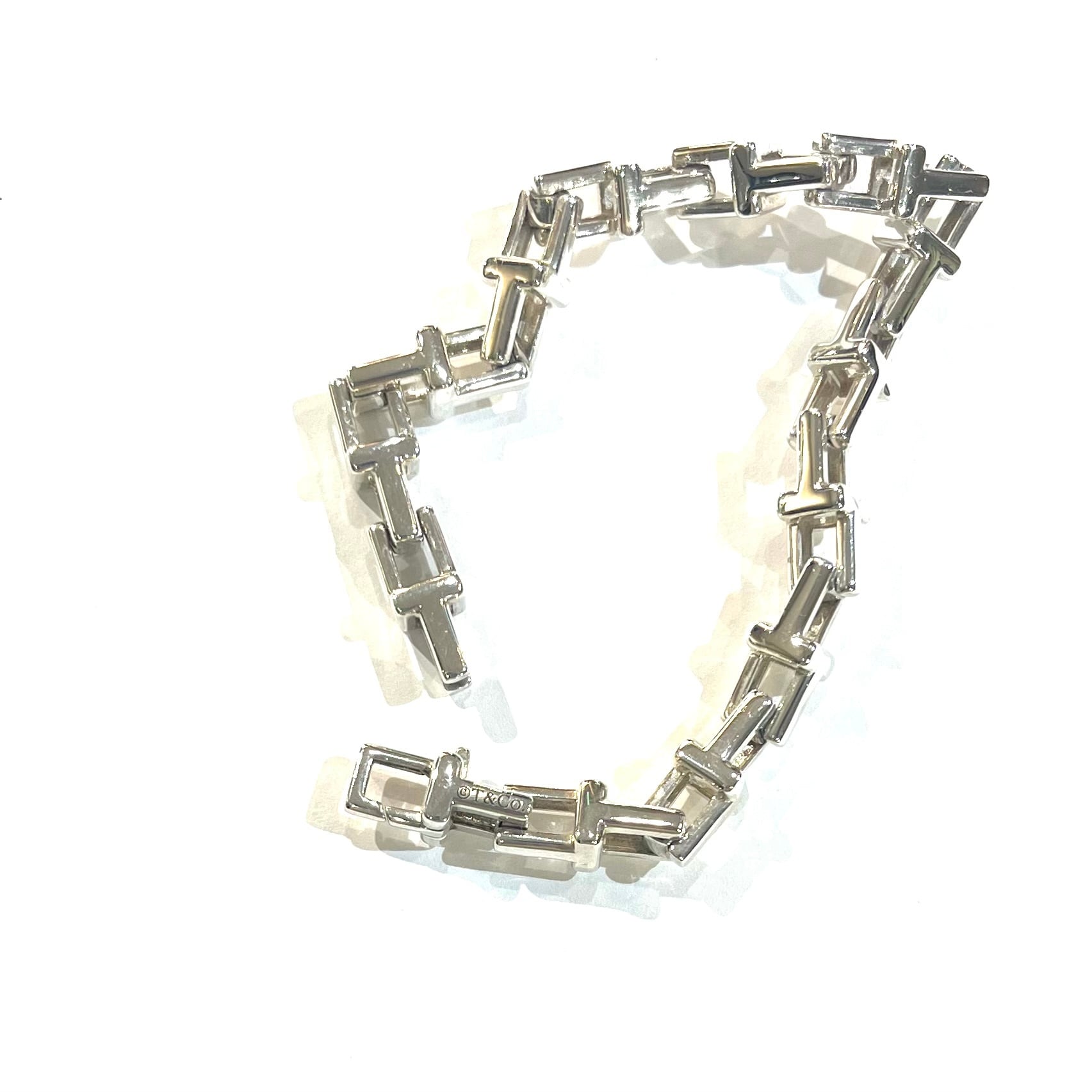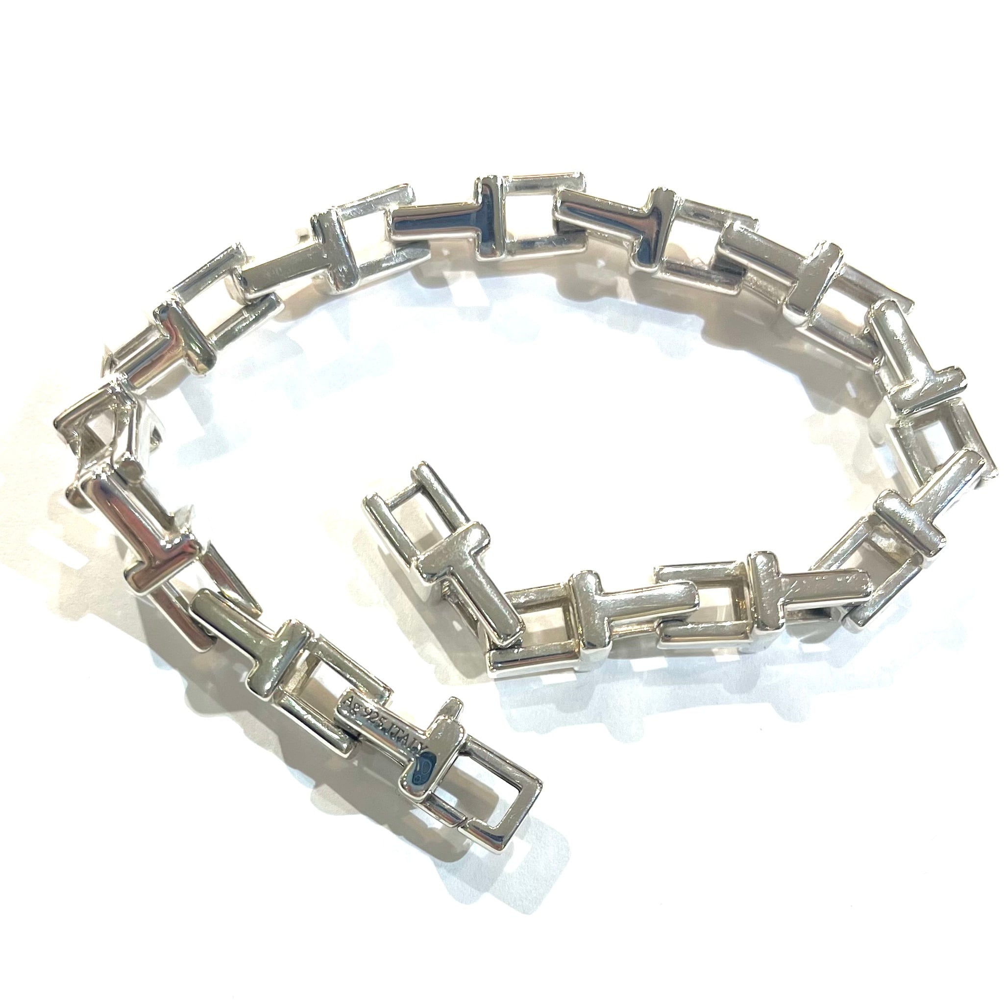 立体的に組まれた“T”パーツが連なる、ヴィンテージティファニーの中でも特に流通が少ないレアモデルです。重厚感のあるシルバー925ながら、直線的なリンクが手元をすっきり見せ、一本でスタイルが完成します。