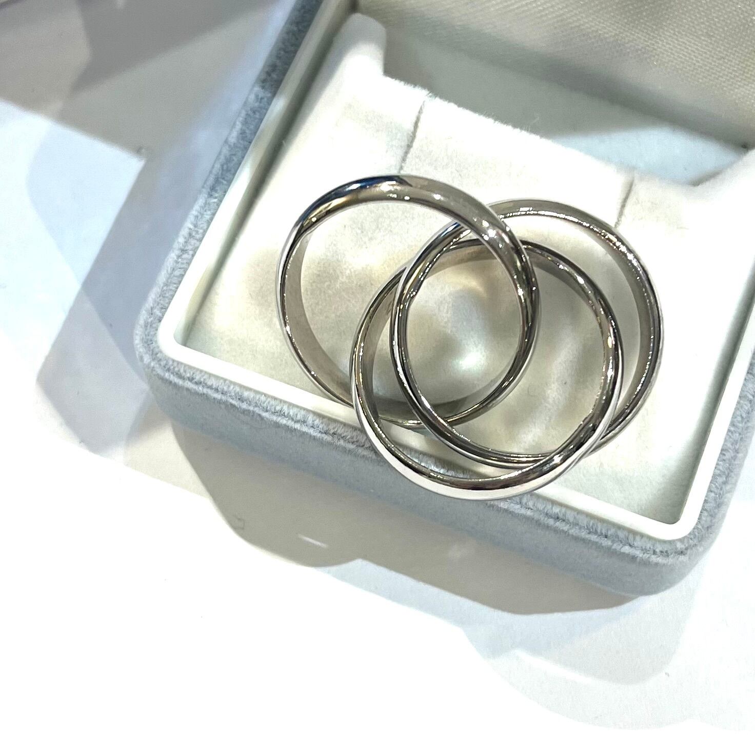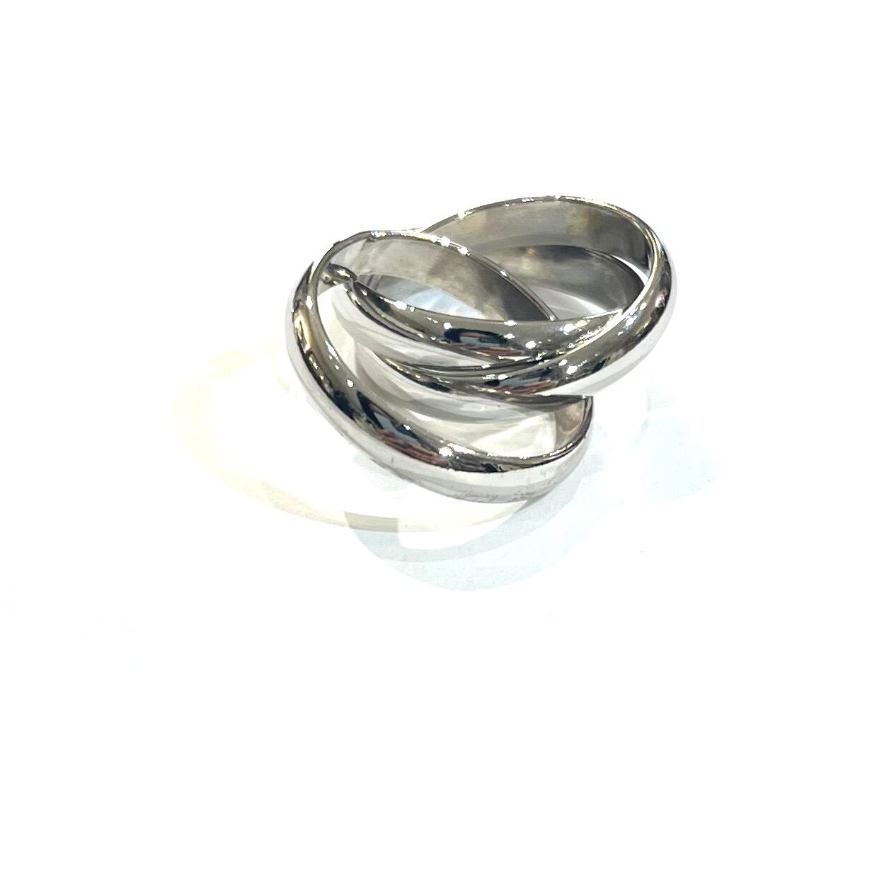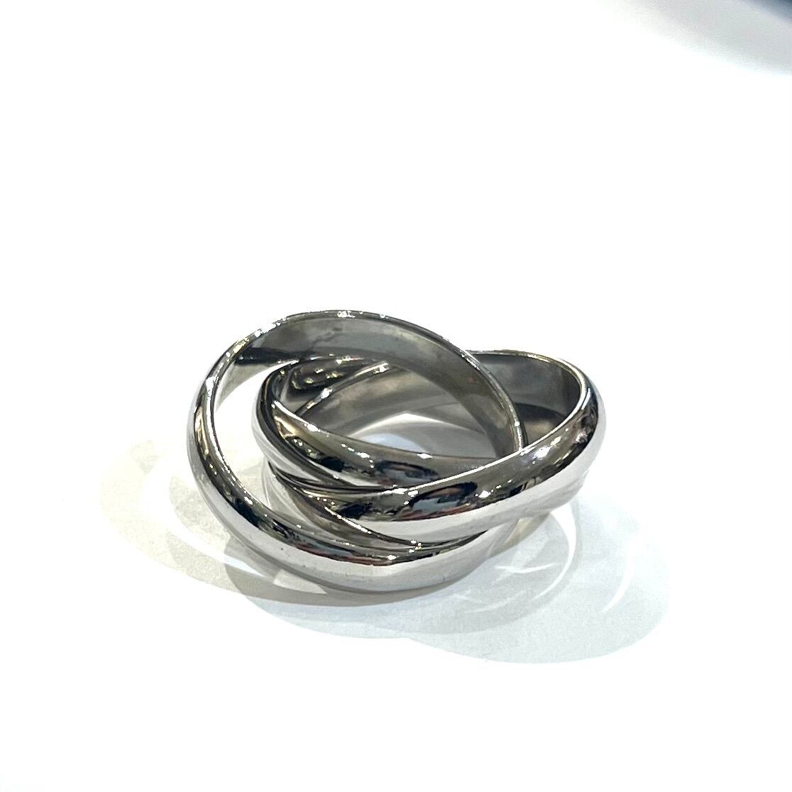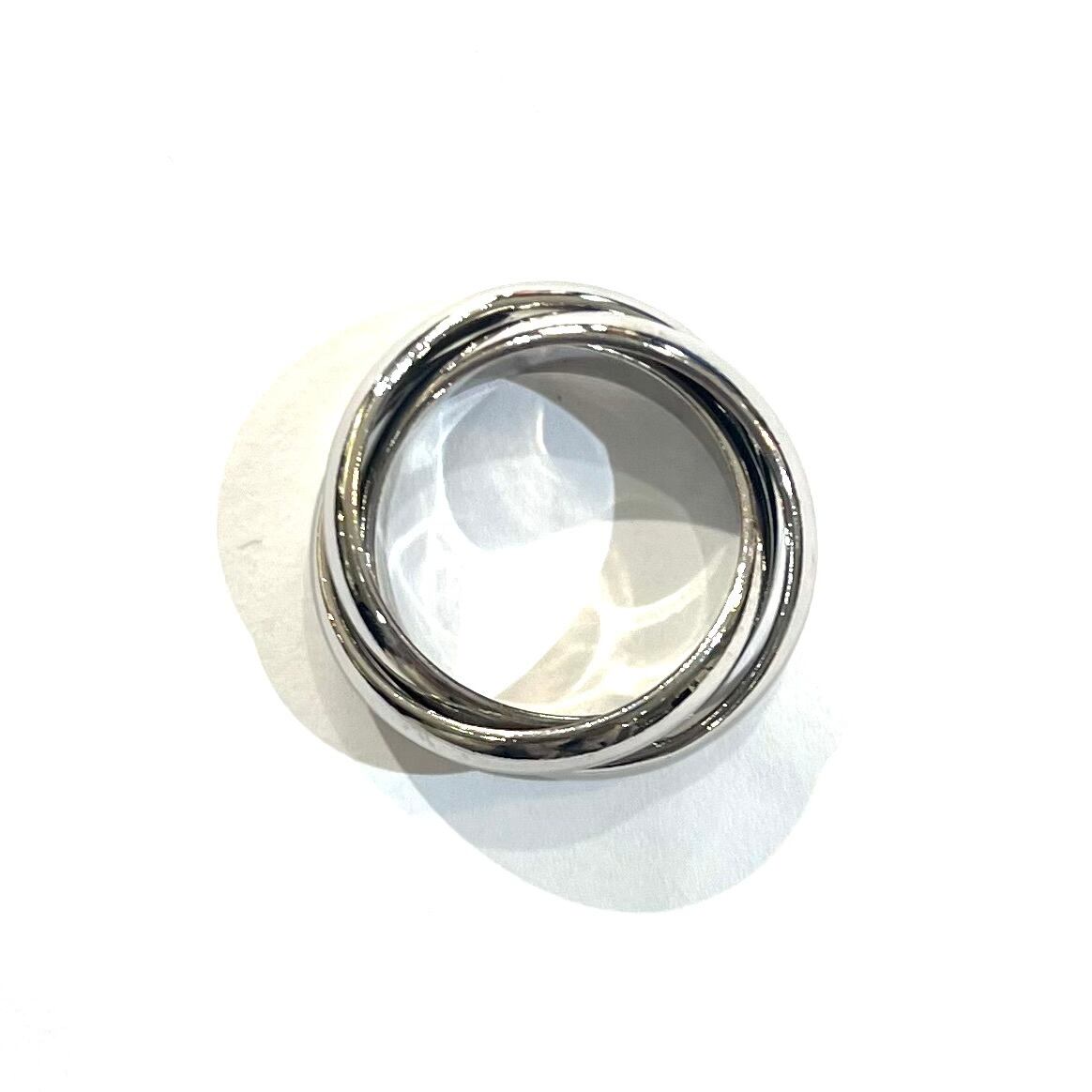 滑らかな曲線を描く3本のリングが重なり合う構造で、角度によって表情が変わる立体的なデザイン。