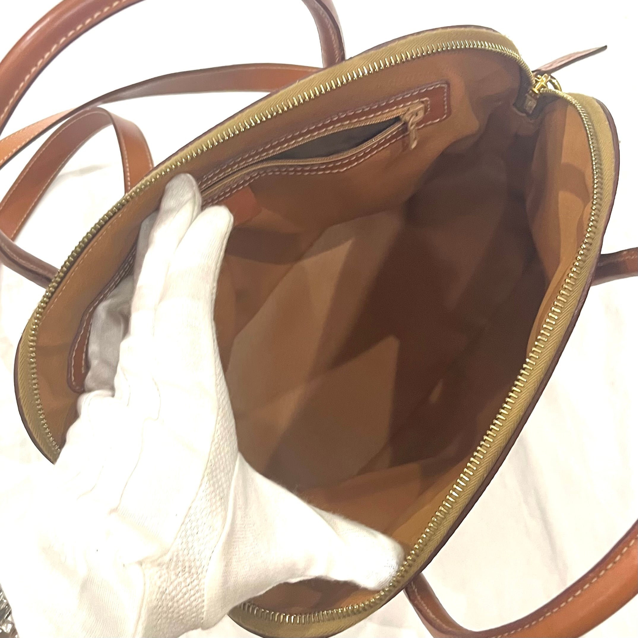 落ち着いたブラウンカラーのPVC素材に、レザーのハンドルとトリミングを組み合わせた、クラシックで上品な佇まい。