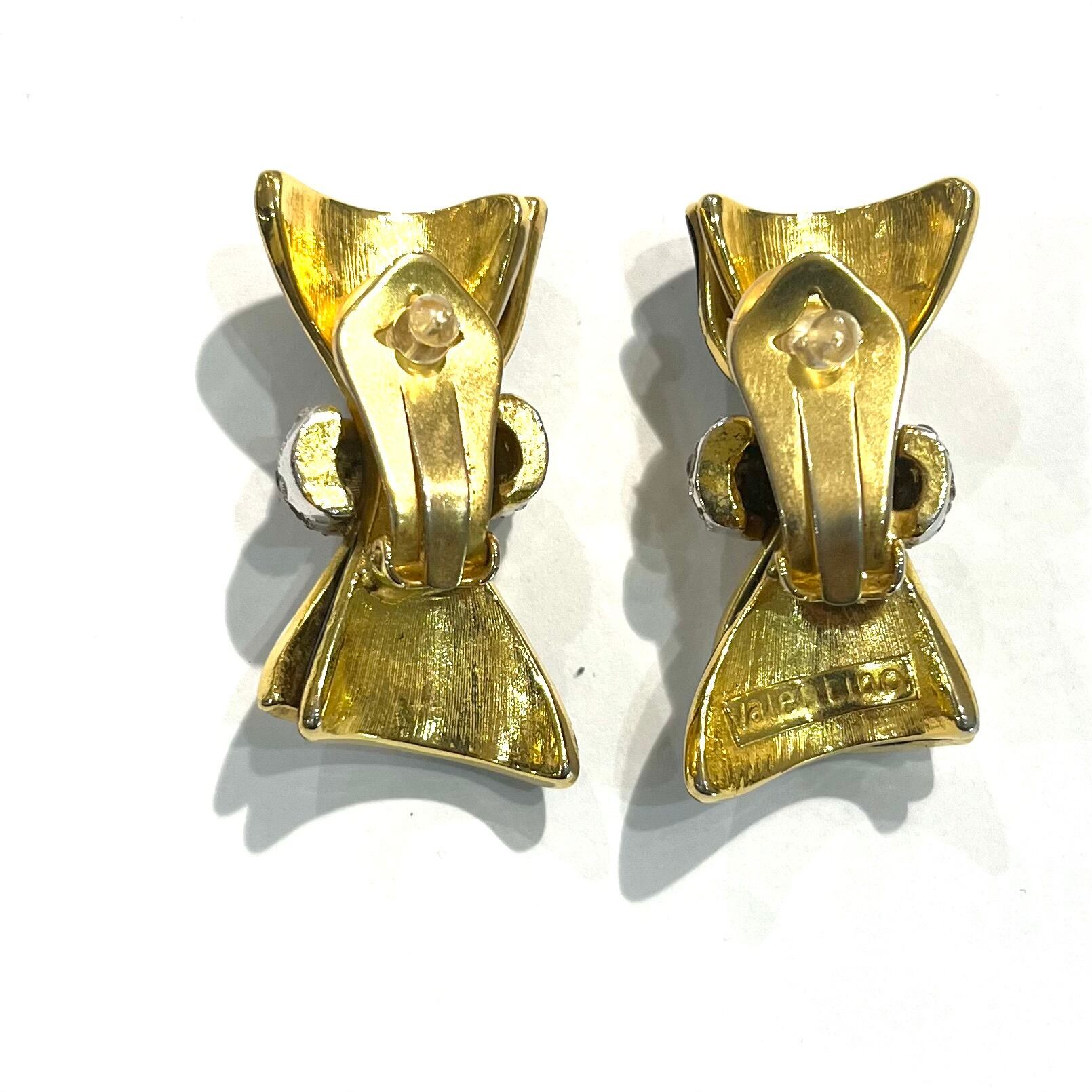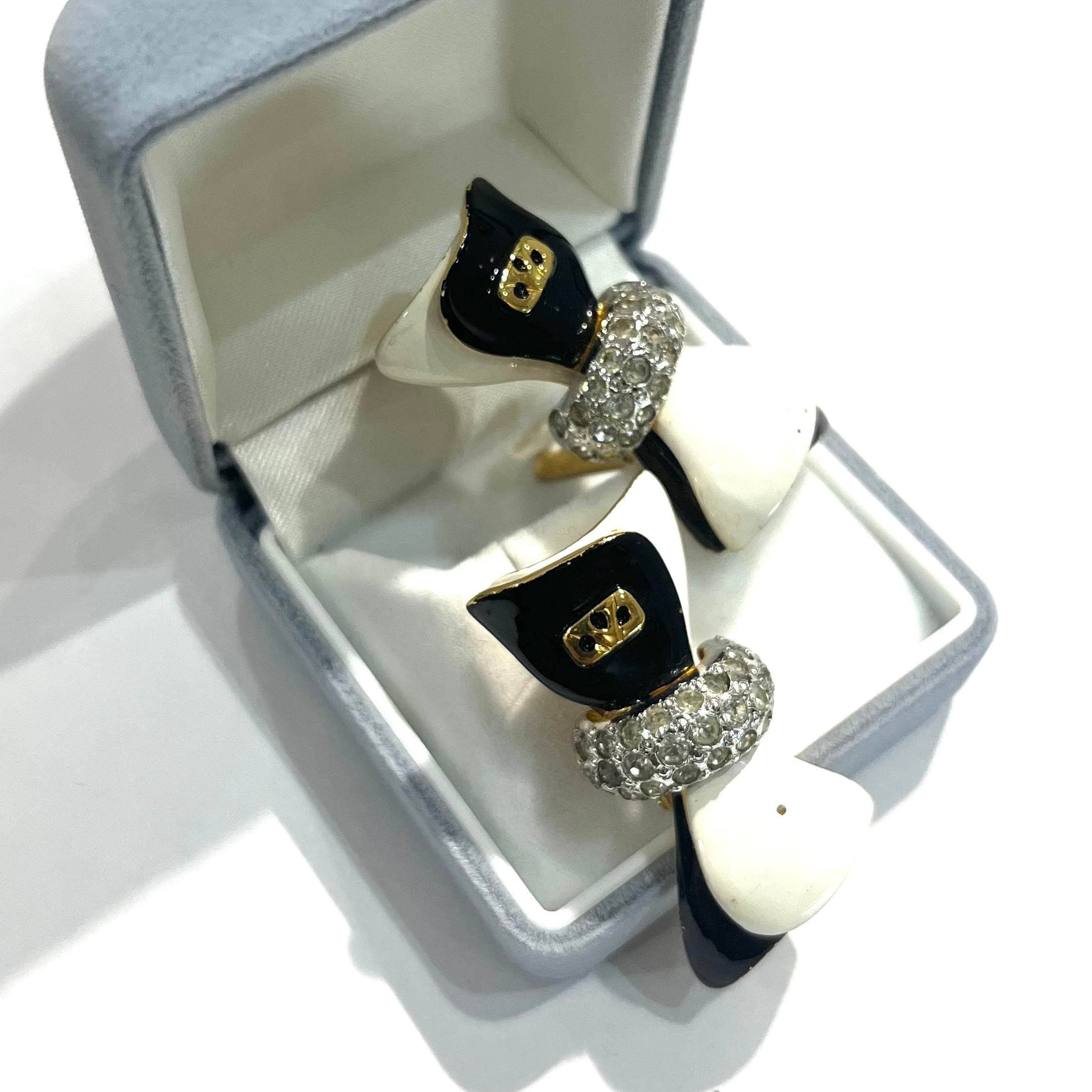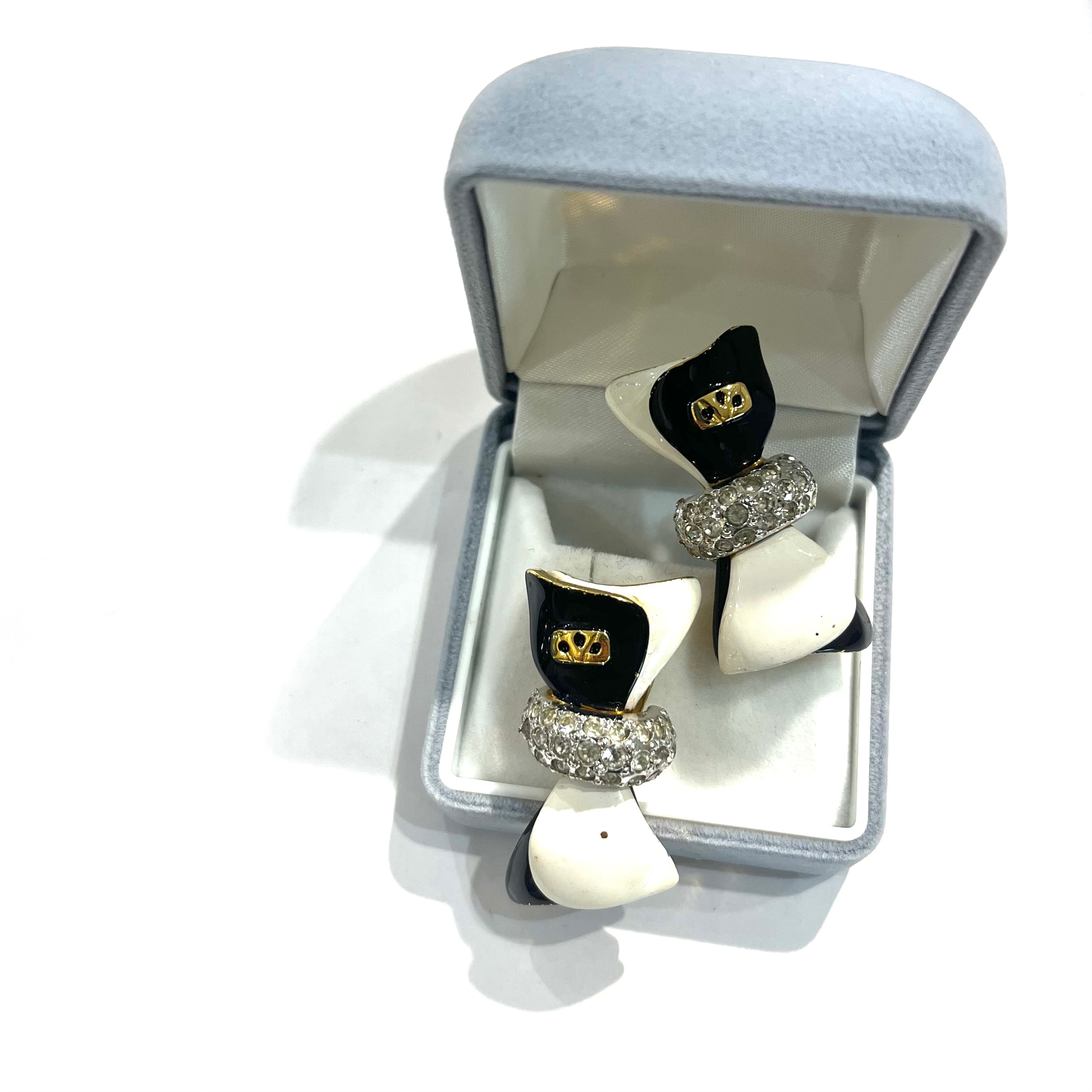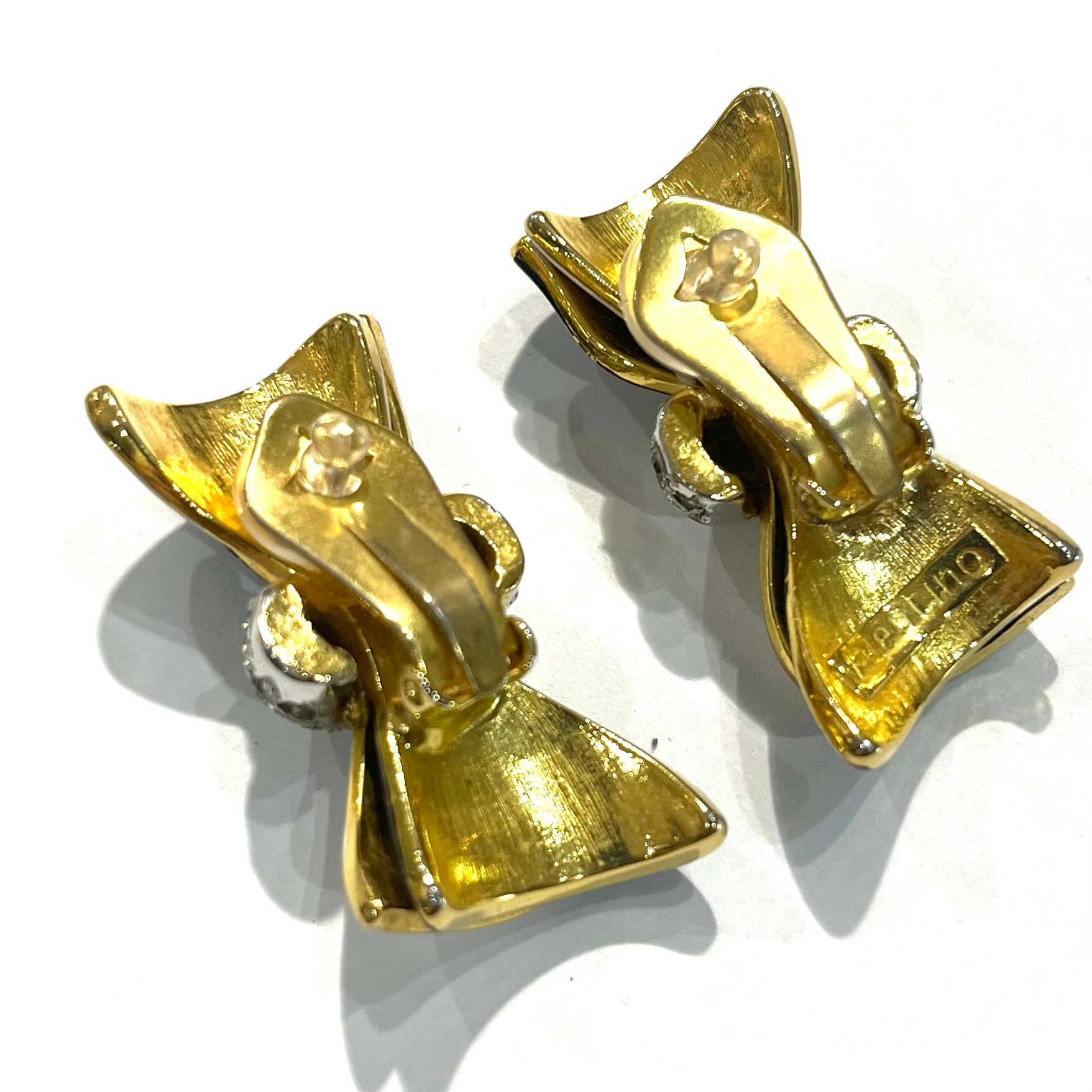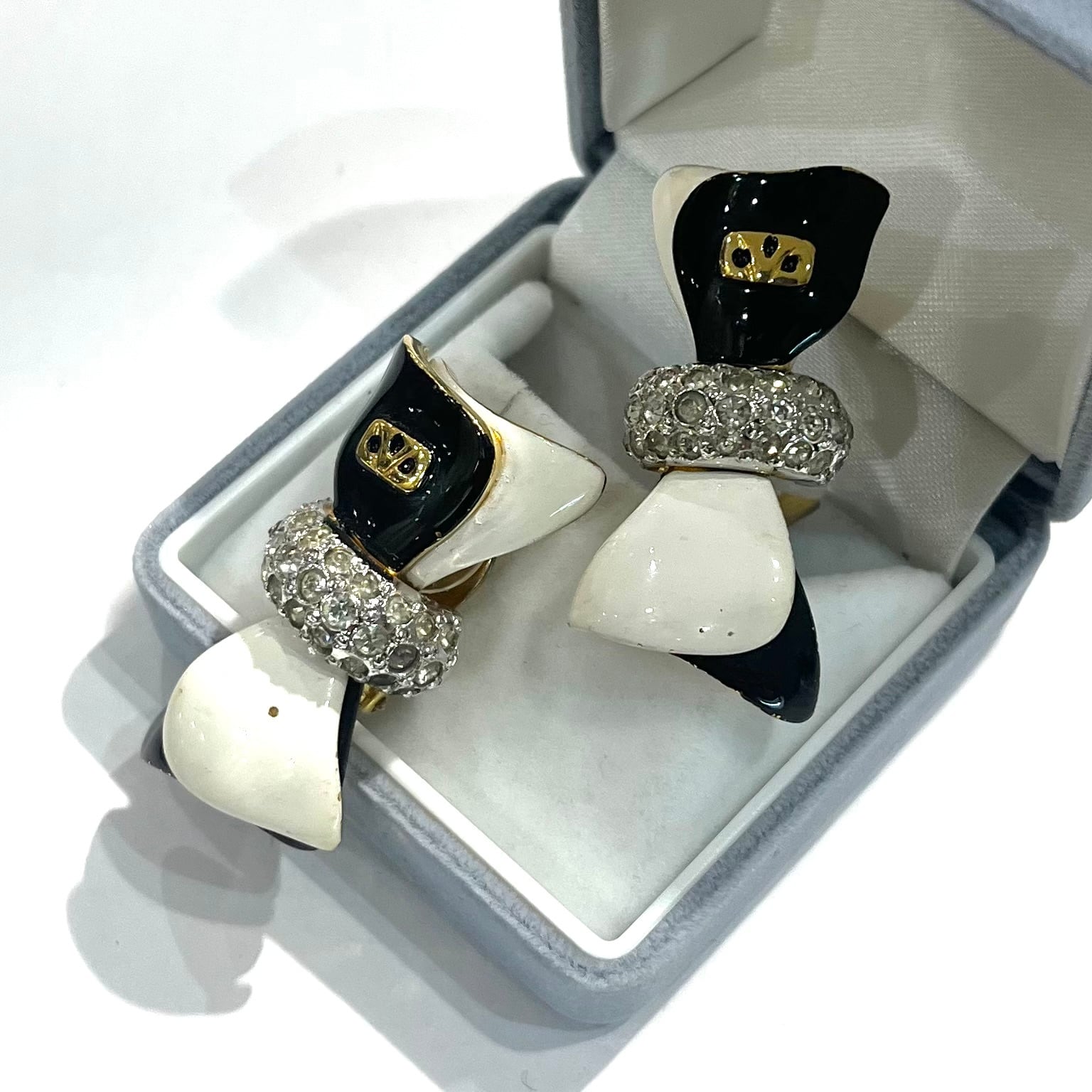 希少【VALENTINO】0001 イタリアの名門。バレンチノ ボリュームストーン輝く。ブラック×ホワイト リボンイヤリング/立体デザイン/大人のためのヴィンテージアンティーク フェミニン モノトーン ゴールド アンティーク