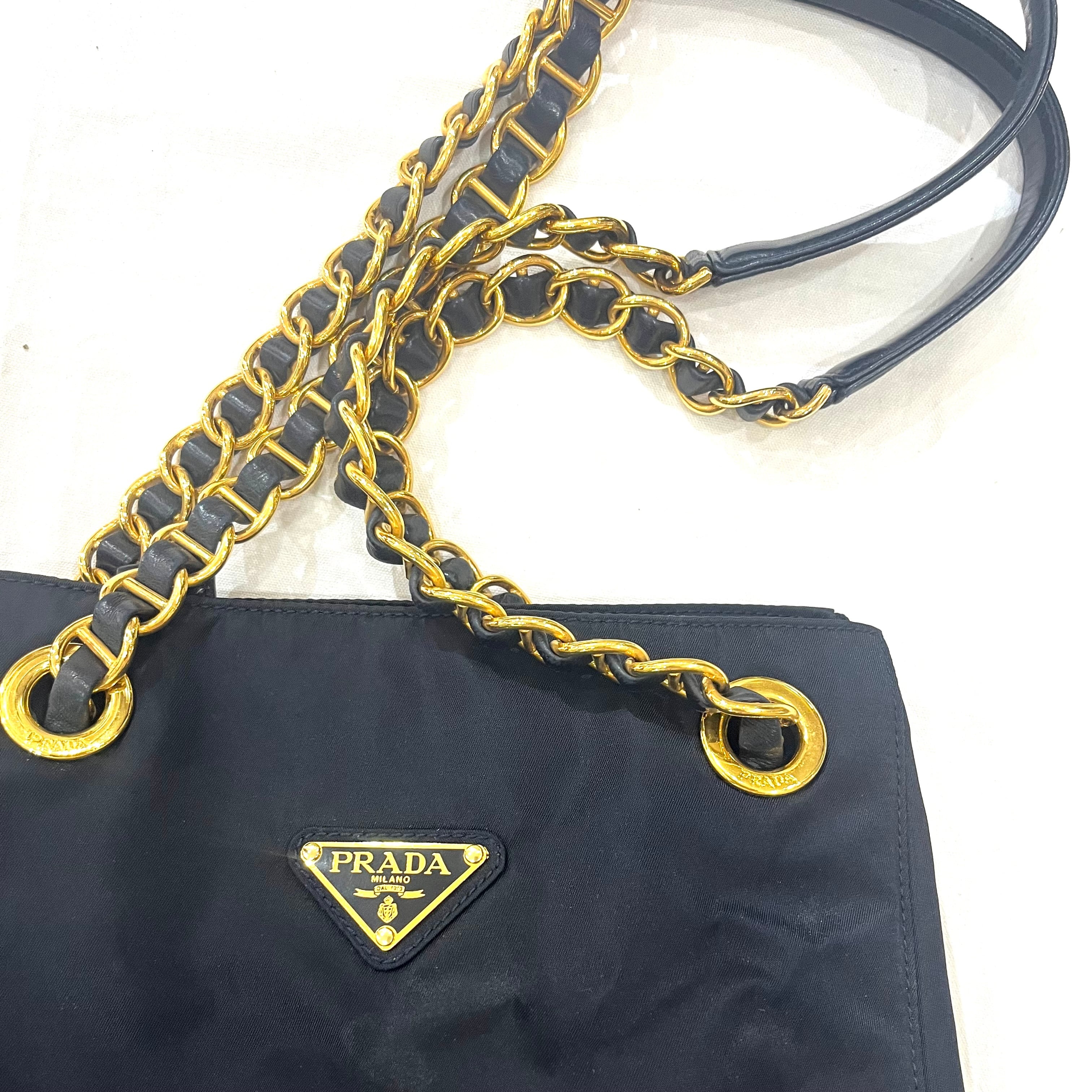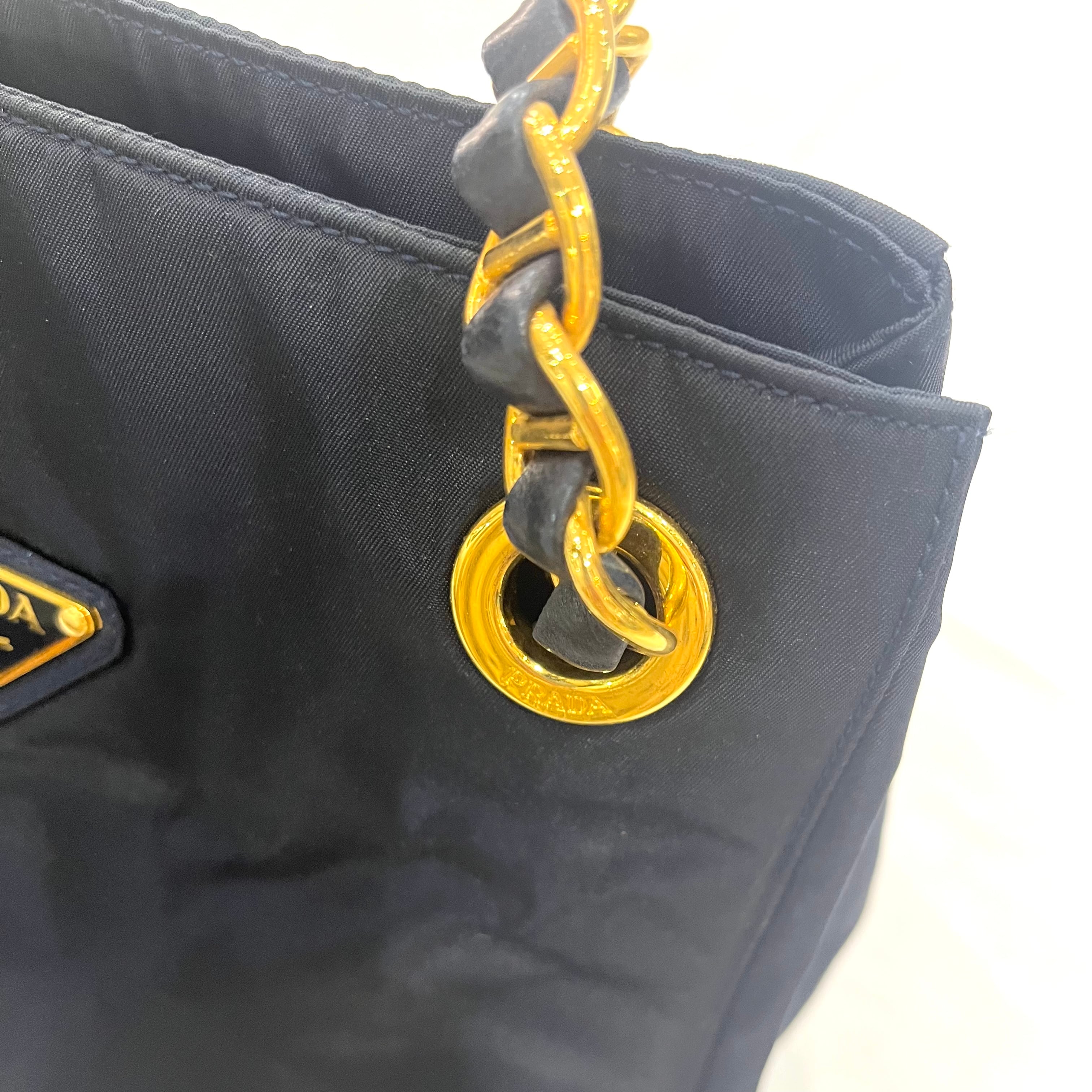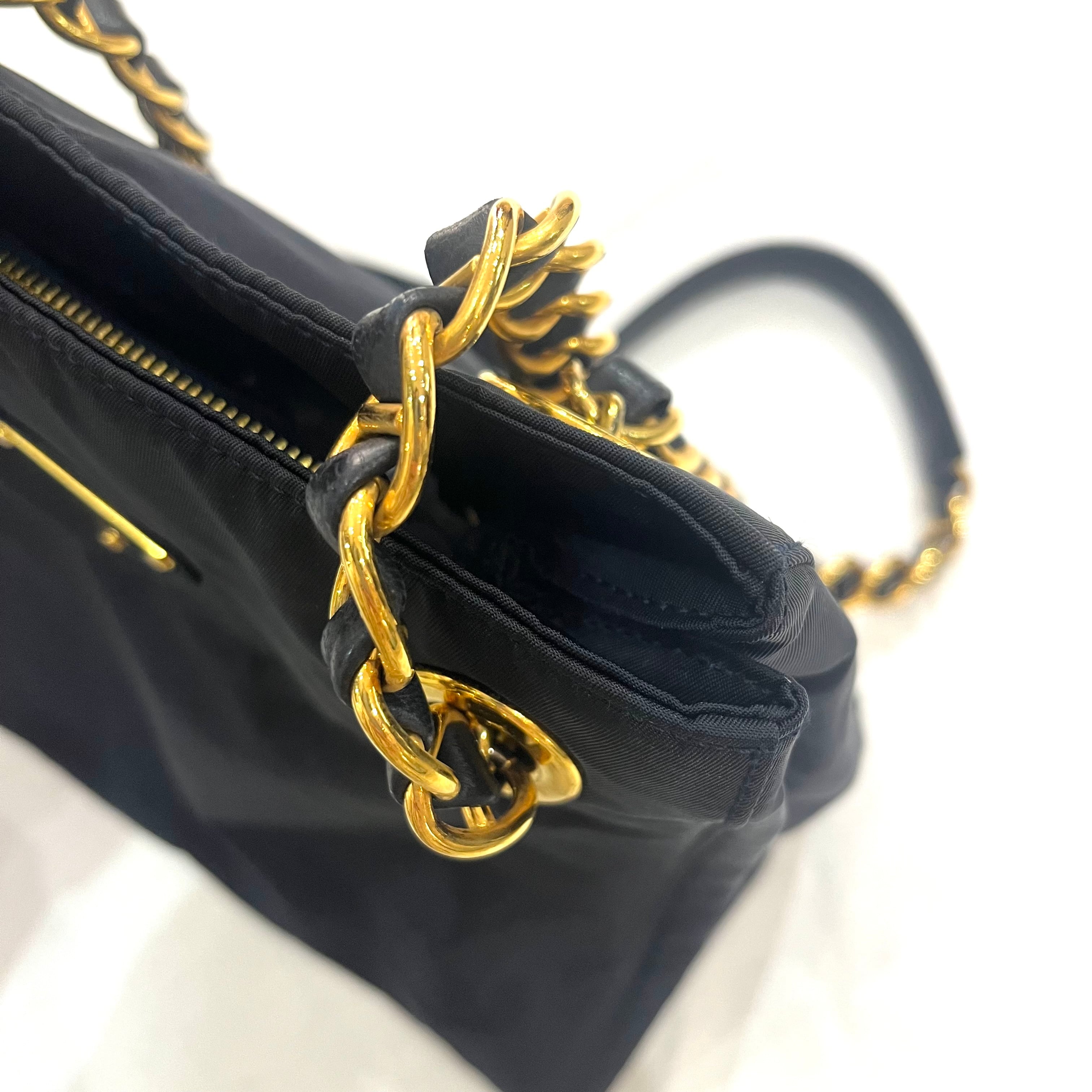 【PRADA】プラダ ナイロン チェーントートバッグ ブラック ゴールドチェーン 三角ロゴ 肩掛けOK 軽量 通勤バッグ ヴィンテージプラダ容量フォーマルバッグ ベーシック プラダチェーンバッグ