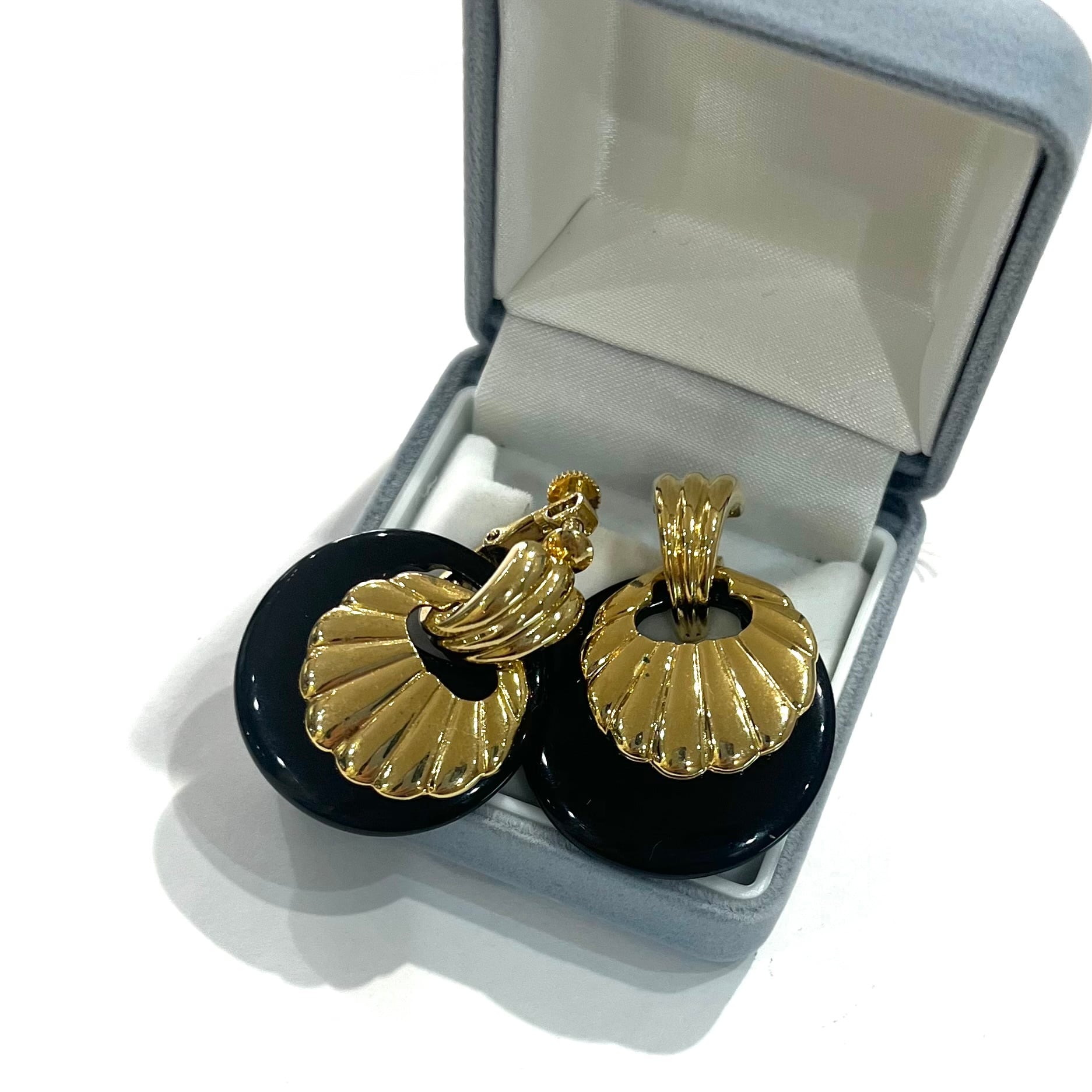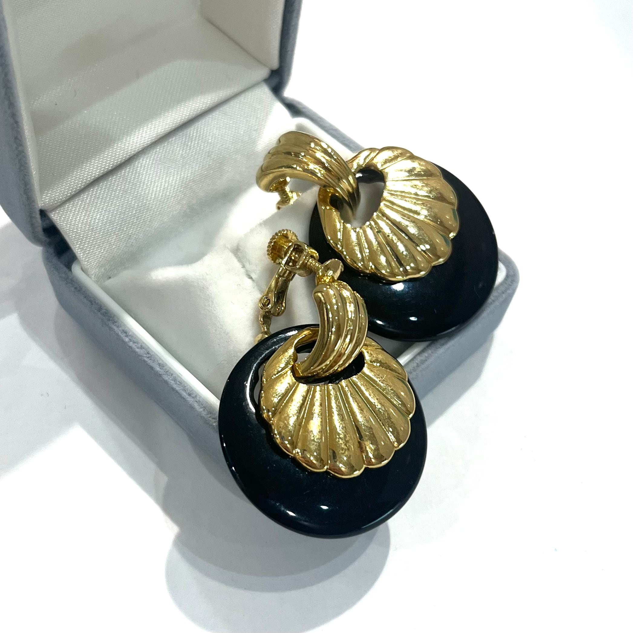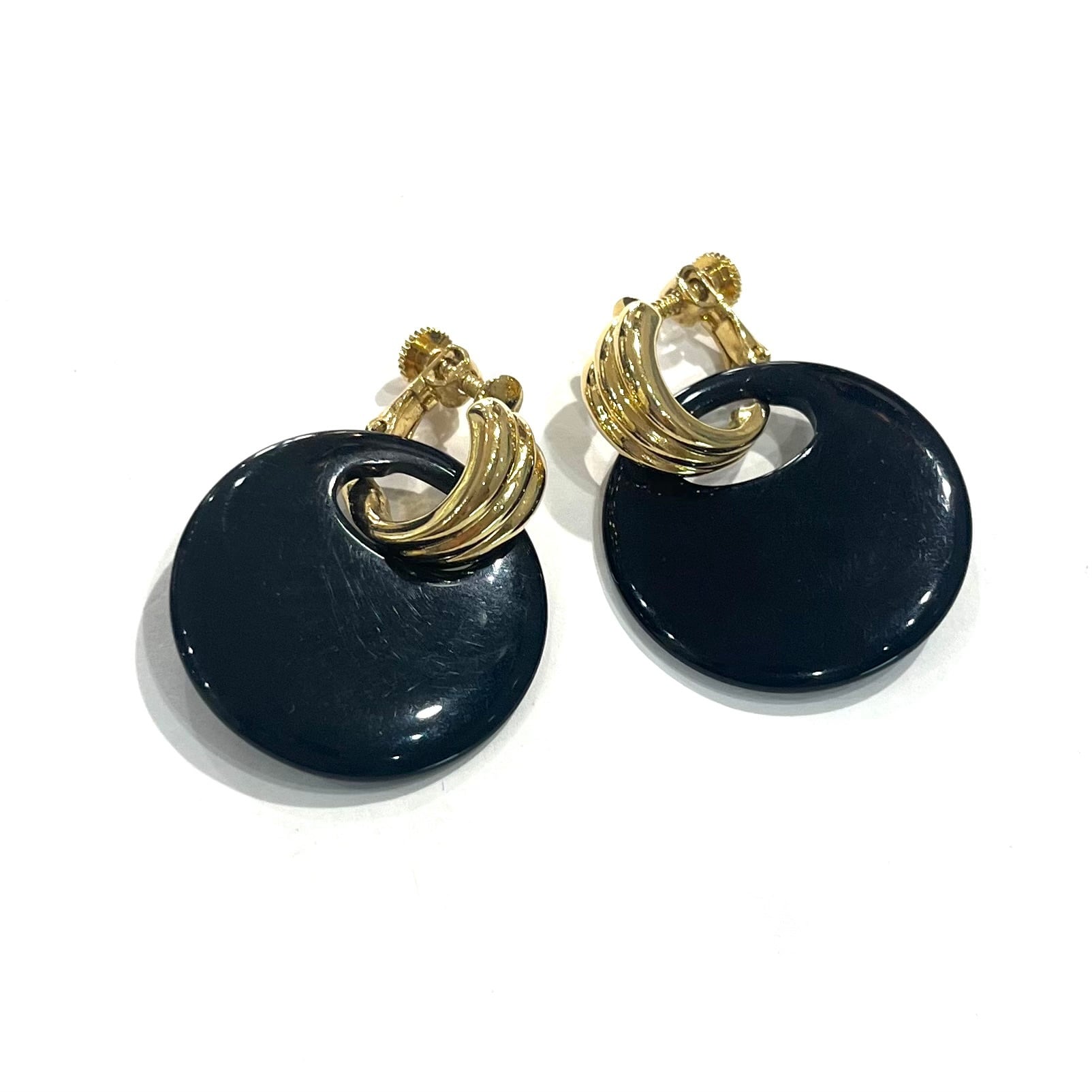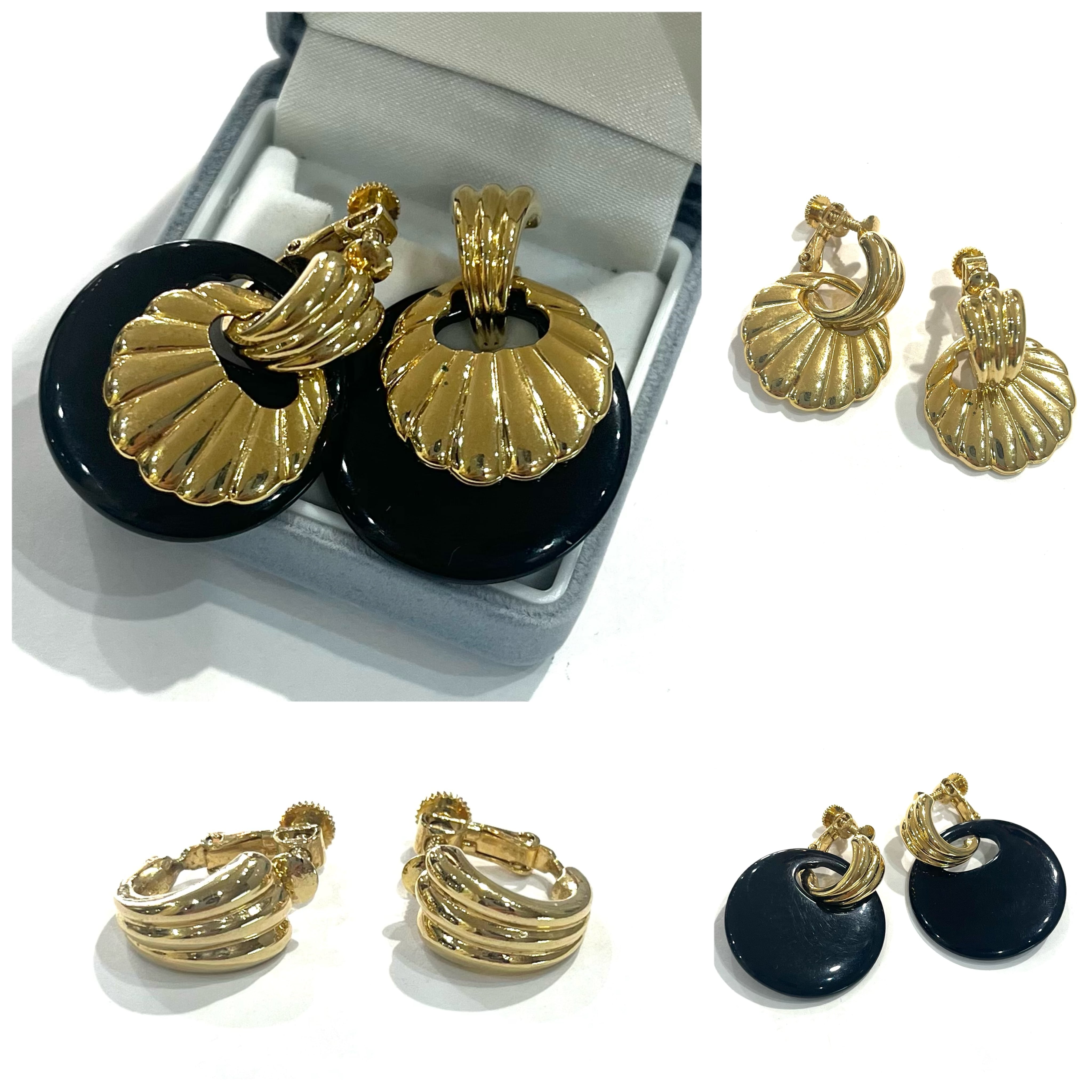 AVONイヤリング/ヴィンテージイヤリング/ブラックイヤリング/ゴールドイヤリング/大ぶりイヤリング/モードアクセサリー/レトロアクセサリー/コスチュームジュエリー/アメリカンヴィンテージ/40代ファッション/50代ファッション/一点物アクセサリー/クラシックコーデ/フォーマルアクセサリー/大人アクセサリー