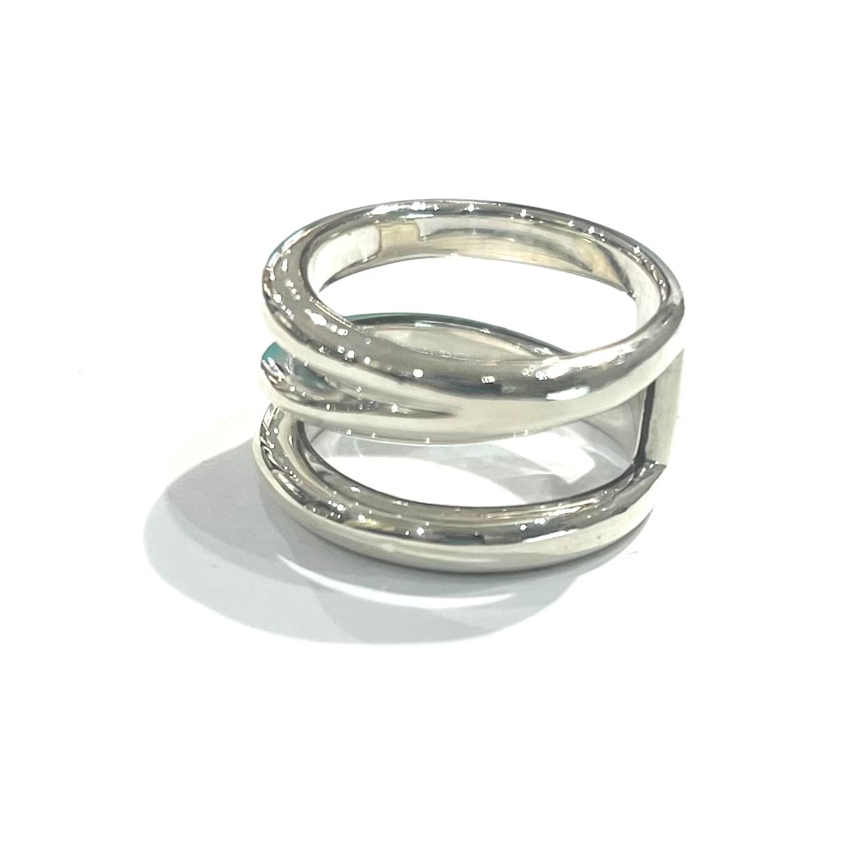 2本のリングが交差するような Wフェイス構造 で、正面の角度を変えることで印象が変わるデザイン。
