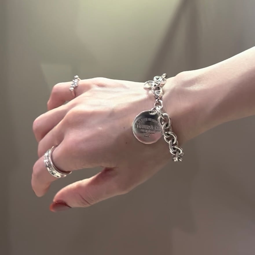 直径2.3cmの丸タグが存在感を放ち、シルバー925の上質な輝きが手元を華やかに引き立てます。