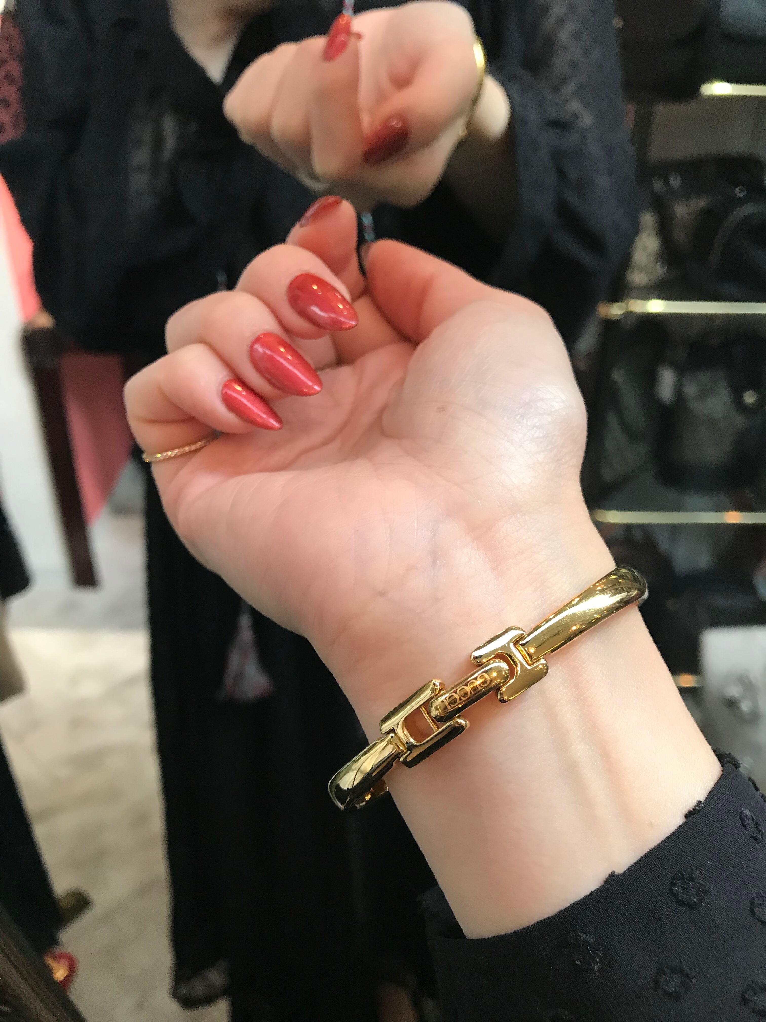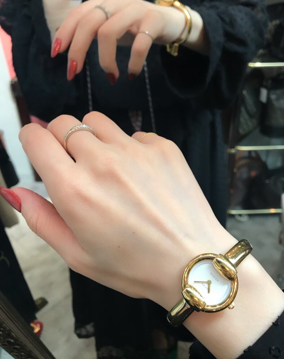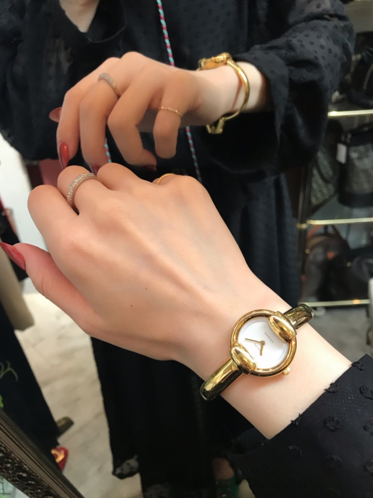 柔らかなフェイスにデザインあるバングルのゴールドが相性抜群!