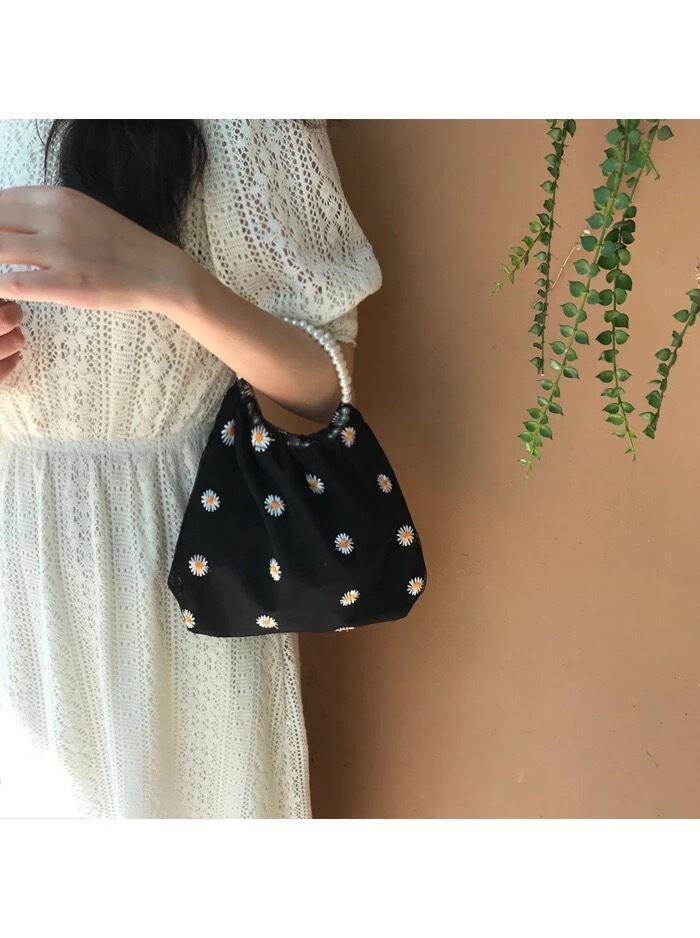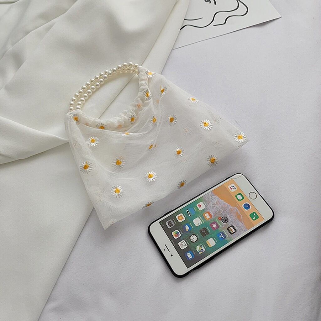 即発送✿︎パールオーガンジーimport 刺繍プリントエコバッグナチュラル スクエア カゴバッグ カジュアル ルーム ミニバッグ